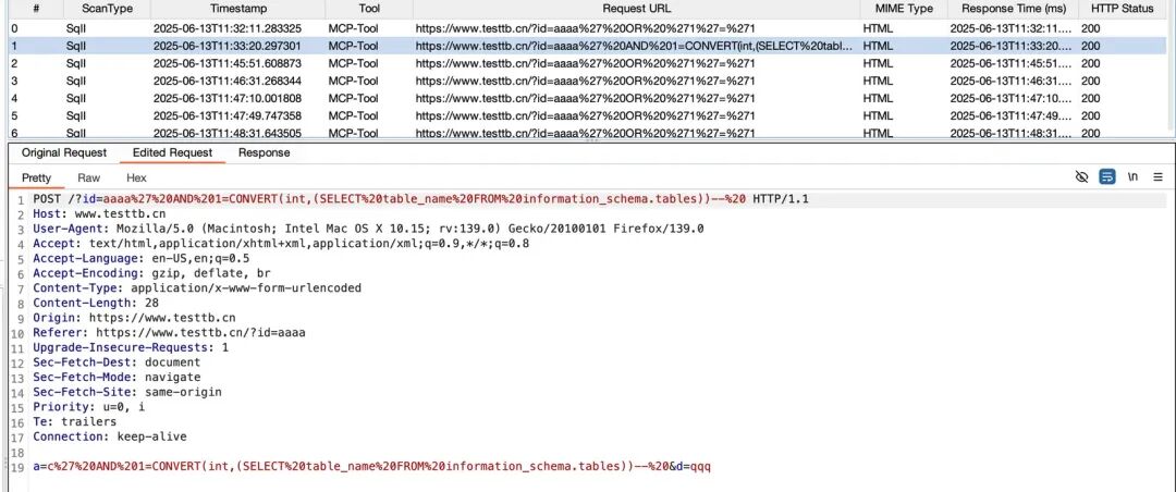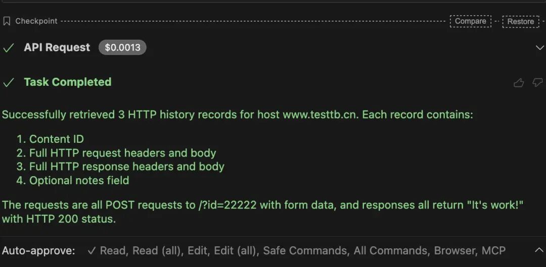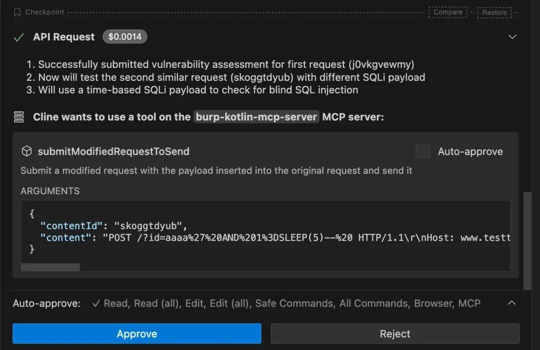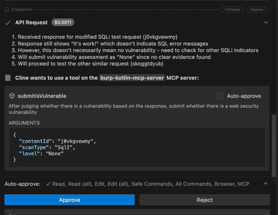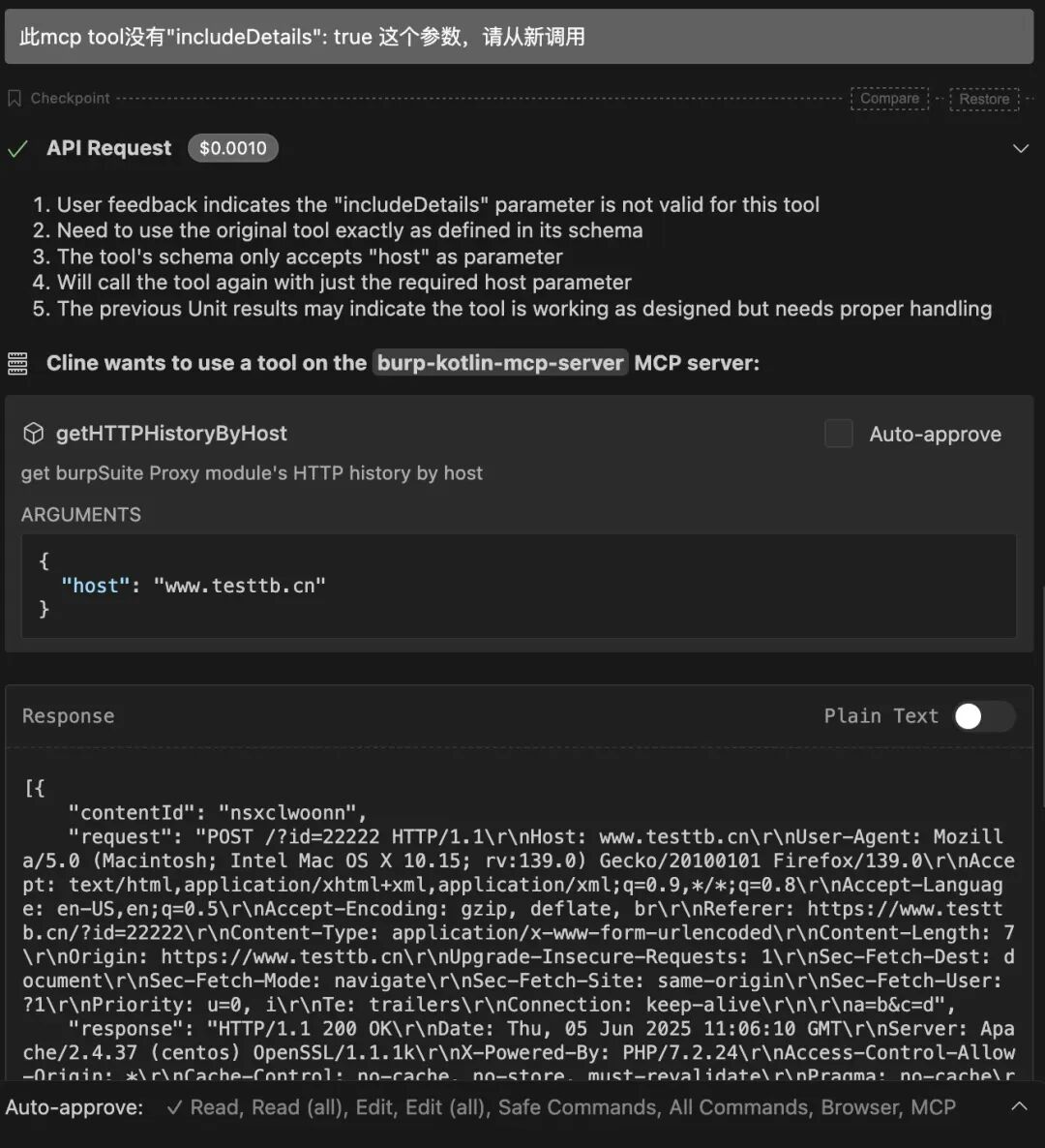 从目前的实际操作来看,解决方案是尽可能的在调用tools之前需要尽量精确的提示词,以及在对tools的编码的时候对inputSchema、description尽量准确描述。 第二个正确顺序执行tools的问题表现为在前面的提示词中,理想情况是大模型在调用一次安全漏洞检测tool后,会顺序执行安全漏洞上报tool。但是非常不幸的是在我把整个流程都开启Auto Approve后发现安全漏洞检测tool执行了10次,但是安全漏洞上报tool只执行了2次。也就是说大模型并没有在每次做了安全检测后都上报本次payload是否存在安全漏洞。 此问题的解决办法目前是强化提示词,例如: 调用burp-kotlin-mcp-server的工具获取所有的http消息的历史记录,同时分析每个请求是否可能存在sql注入漏洞,如果可能存在,在尽可能的生成足够多和不同的的payload以后原始的请求里面插入payload以后直接返回修改后的请求,当然如果payload是插入到url的query参数里面那么必须进行url编码,并将请求通过burp-kotlin-mcp-server的工具发送回去。同时在接收到修改后的http报文的响应后根据想要判断是否存在安全漏洞,并调用工具上报是否存在对应的安全漏洞。这个过程需要循环执行,直到根据响应可以判断存在安全漏洞。