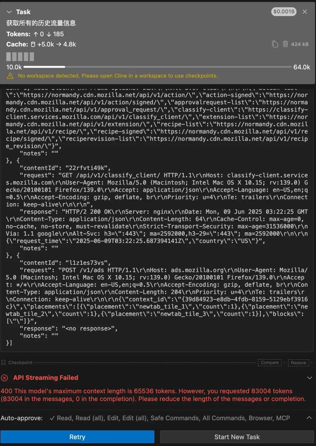 从上面图片可以看到,大模型已经成功在流量里面它认为存在sql注入的参数里面都插入了payload,包括了url里面的query参数,还有body里面的参数。 当然,前面的几个步骤的Approve都有用户的点击参与,实际上这里通过在cline上面设置可以完成做到Auto Approve来实现100%自动化。 在本次实践中遇到了一些问题以及应对的挑战,主要有下面几点: 在我的另外一篇文章里面其实已经提到这个token限制的问题,在这里再次遇到。我理解这是一个需要大模型实际解决的问题,因为在实际的http报文分析过程中,很容易超出65536 token的限制: