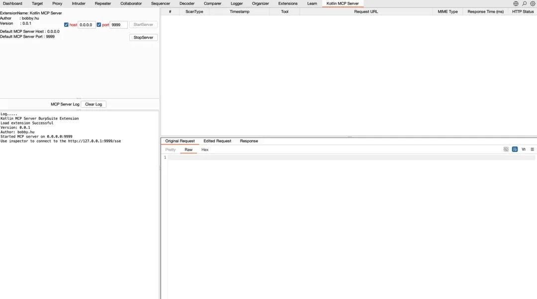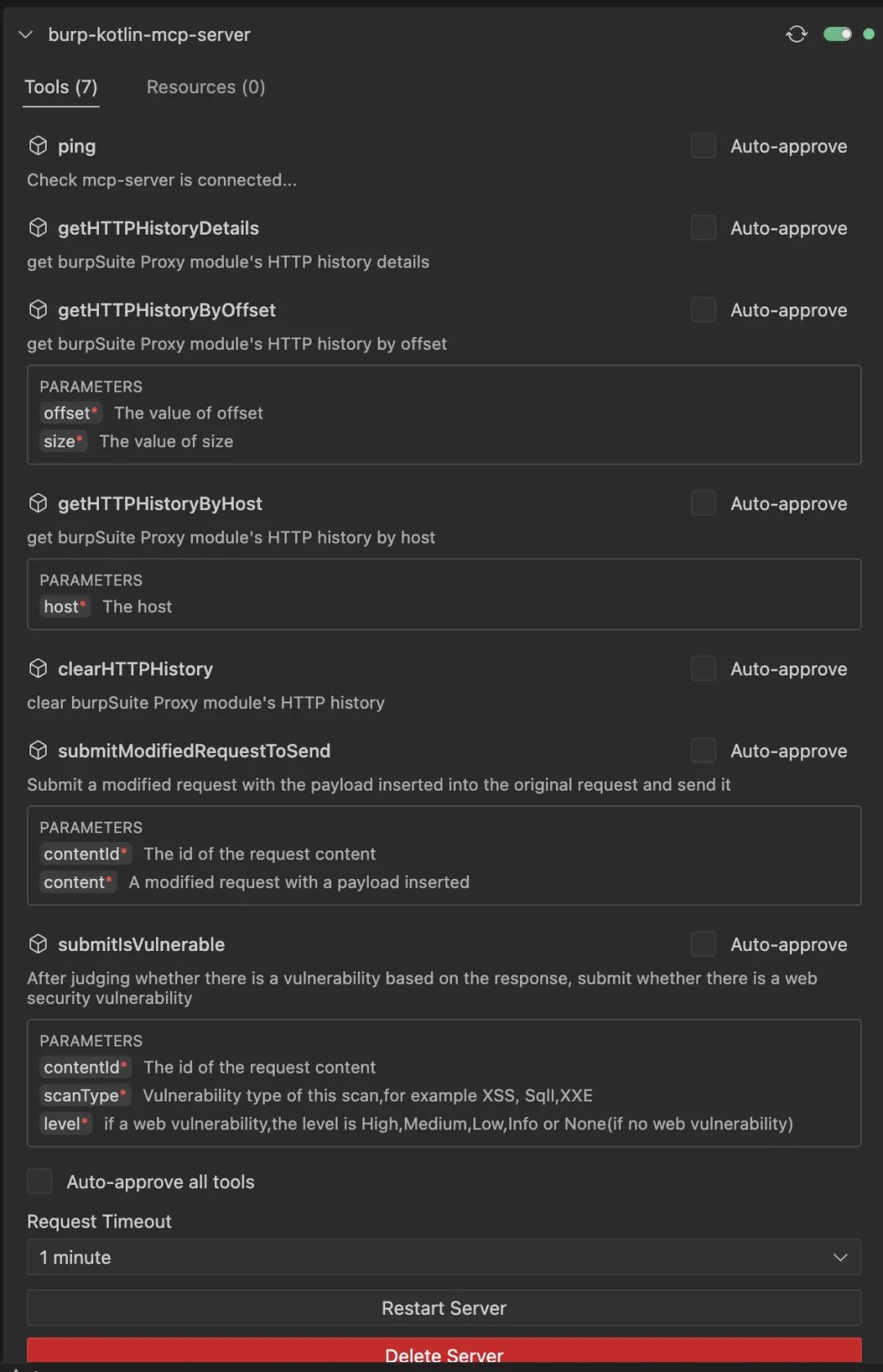 下面是运行环境的基本条件: 按照下面操作步骤即可: 在编写的Kotlin MCP Server的项目根目录下面执行mvn clean package编译目标jar包。 在burp的Extensions模块加载此jar包,同时在插件的UI上面点击StartServer来启动MCP Server。 在cline客户端上面通过Remote Servers里面加载此MCP Server,默认地址是http://127.0.0.1:9999/sse