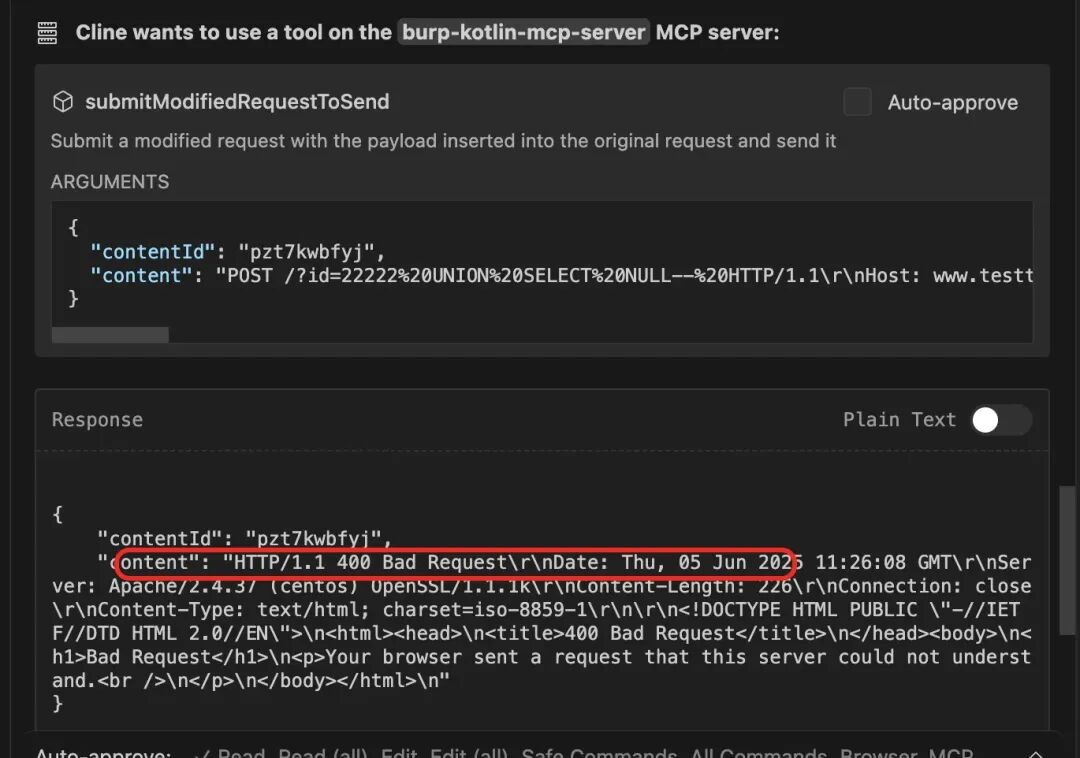 比如我在让大模型调用获取burpSuite的所有历史记录的mcp tool时候就出现了(如果这个时候burpSuite的历史记录足够多,或者存在超大型Content-Length)。这个时候的解决办法就需要下面2点: funhttpRequestResponseFilter(history ist< roxyHttpRequestResponse>) ist<HttpRequestResponse>{valresponseExcludePatterns=listOf("^image/.*","^application/pdf.*","^text/css.*")valhistoryNew=history.filter{valhasResponse=it.hasResponse()valhasContentType=hasResponse&&it.response().hasHeader("Content-Type")//条件1:无Response→保留if(!hasResponse)return@filtertrue//条件2:有Response但无Content-Type→保留if(!hasContentType)return@filtertrue//条件3:有Content-Type→过滤匹配的正则表达式valcontentType=it.response().headerValue("Content-Type")!!!responseExcludePatterns.any{pattern->contentType.matches(Regex(pattern))}}.map{HttpRequestResponse.httpRequestResponse(it.request(),it.response(),it.annotations())}returnhistoryNew} 大模型在原始HTTP报文插入payload格式问题 大模型在原始HTTP报文插入payload的时候,有时候出现了格式混乱为非法http报文导致web服务端无法正常解析和响应。 这个case是因为在cline上看到一个web服务端响应无法识别的错误,如下图所示: