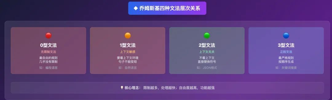 这个谱系是一个形式文法类别的包含谱系,从0型(无限制)到3型(正则),每一层级都是其上一层级的真子集,看这个图表: