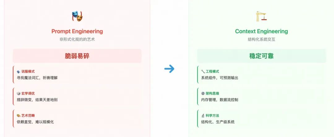 Context Engineering代表了向更高形式化程度的重大转变,用结构化的、机器可读的上下文取代了模糊的自然语言指令。它不再将LLM视为一个需要被说服的对话者,而是将其作为一个更庞大的信息处理流水线中的一个组件。