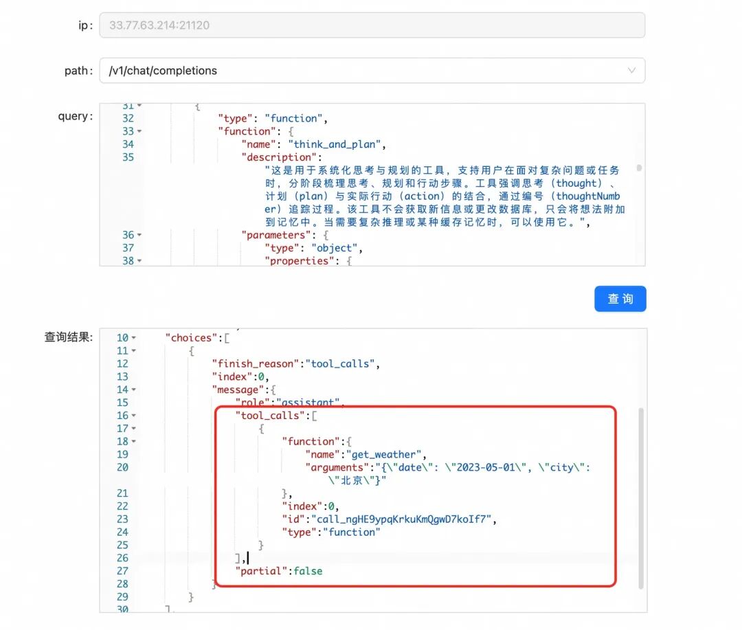 为了尽可能减少用户等待下一次返回的工具名和入参,必须用流式效果将TooCalls的调用过程展示,且避免使用functionCall的流式。因此我们采用了让大模型返回XML标签的方式来获取工具名和入参,并且为了在返回工具名之前能让用户能感知模型在推理,我们提示大模型在返回XML标签的同时生成思考过程,将思考过程流式展示给用户,相当于是将思考规划步骤和工具推理步骤合并。