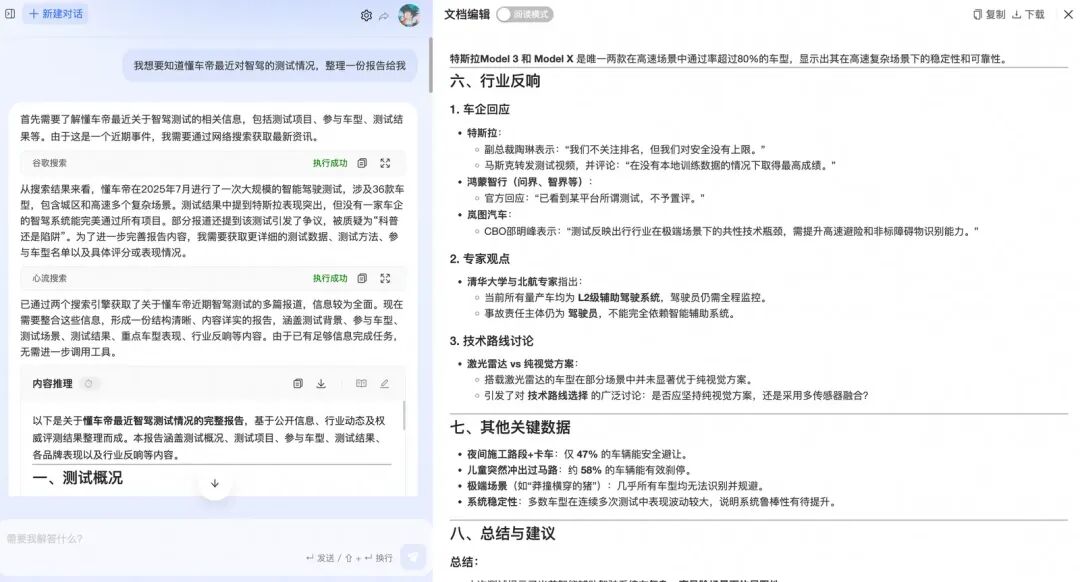 如上图所示,实际上提供的子智能体或者工具没有一个是进行路线规划报告生成的,但因为有一个通用的内容补充工具,在这个case的执行过程中就会适时的生成一份详细的路线规划,给到主智能体足够丰富的知识,因此最终推理的结果也是质量较高。