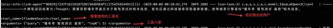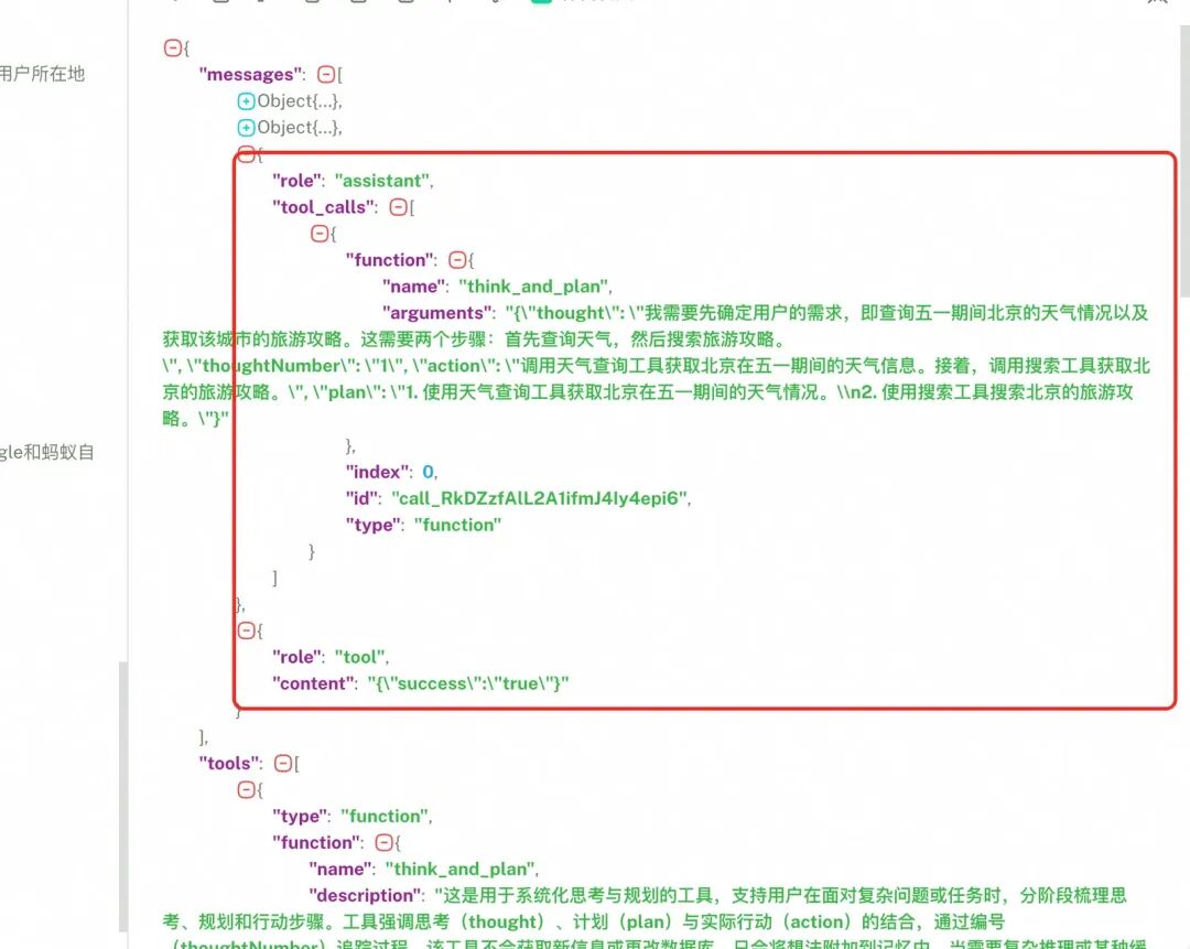 原本使用FunctionCall的输出结果如下:(functionCall时将思考规划作为单独的工具,用XML的时候我将工具推理和思考规划统一放在一步里面完成),展示形式不够友好,用户看到的只是平铺的一整段工具调用。
