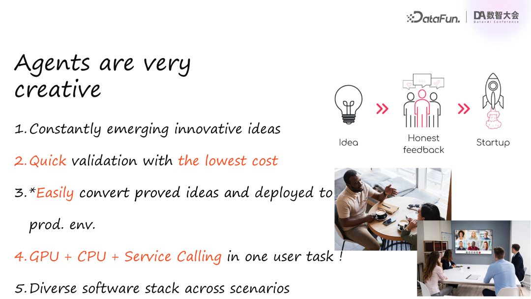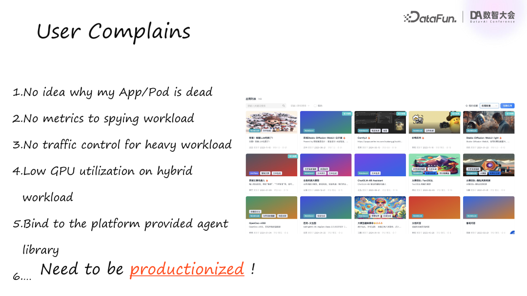 一旦 PoC 验证有效,就希望能迅速部署到线上,但这一步非常困难。上线应用涉及众多模块:服务、数据库、数据来源、分布式框架等,对大公司而言,需要与多个团队合作,小公司虽不需多个团队,但仍需掌握所有技术。因此,PoC 到上线的过程繁琐且漫长。此外,用户任务可能同时涉及 GPU、CPU 和 Service Calling,且 Agent 覆盖不同业务场景,每个场景的技术栈不同,需要大量兼容适配工作。