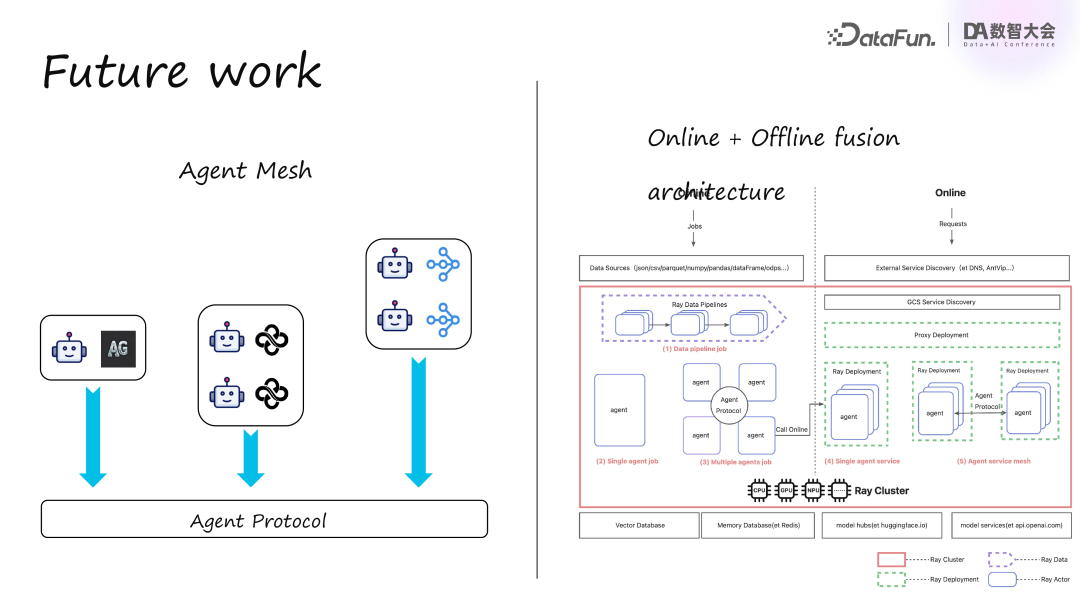 接下来是我们未来的一些工作。首先是 Agent Mesh。目前,Agent 框架众多,但缺乏统一的通信和流程标准。我们希望通过 Agent Protocol 项目,制定一个协议,整合不同框架,实现类似服务网格的通信环境。右图展示的是我们正在开发的离在线一体架构,这在非 Agent 场景下已实现。由于底层执行层都是 Ray,无论在线还是离线,技术栈相同,我们无需特别定制,能够结合使用。