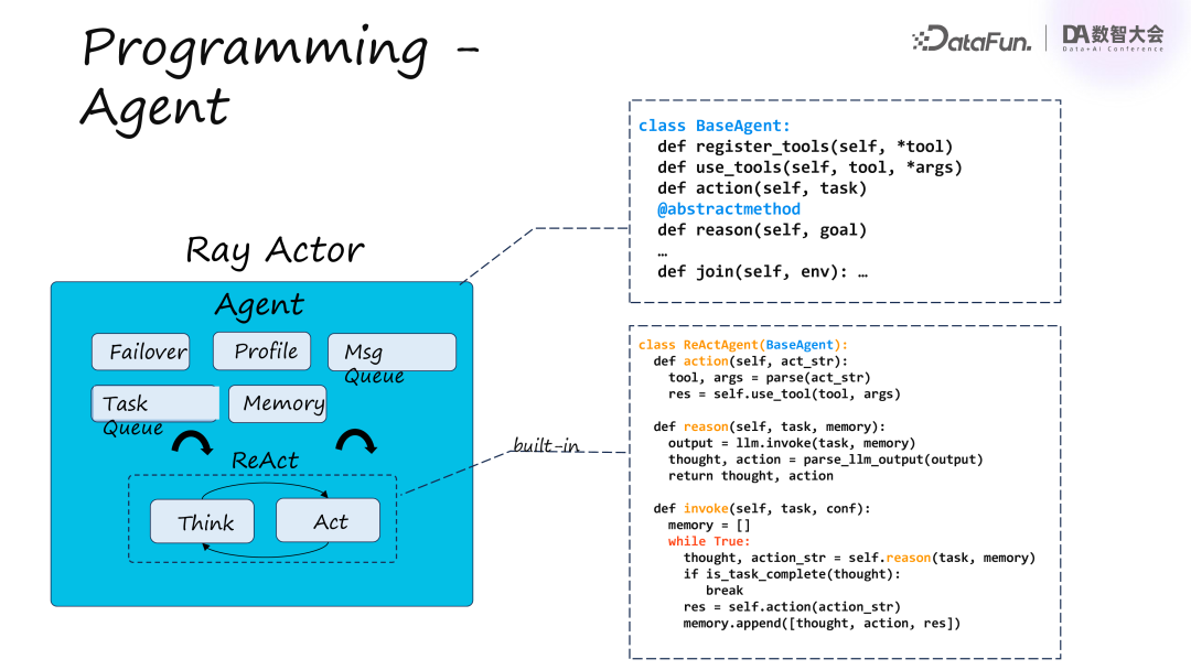 使用 Ragent 编写一个 Agent 时,首先要了解 Ragent 提供的 Agent 概念,这是一个具备 Failover 能力的基础单元,并内置消息队列和 Memory。Memory 是 Agent 内部的记忆。由于存在多种 Planning 策略,Ragent 内置了 ReAct 算法,用于重复的 think 和 act 过程。如上图的简化版代码中,通过一个 while True 循环,每次先进行 reasoning(think),获取 thought 和预期执行的 action,然后实际调用 action,持续在循环中执行。