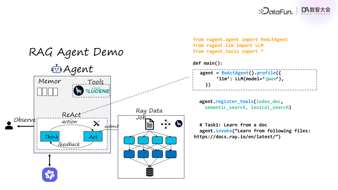 接下来,用户可对文档提问,如询问 Ray 最新版本的 Ray Data 功能,此时 Agent 会从 DB 中进行字符和语义检索,经过大模型处理后返回结果。整个过程只需几行代码即可完成一个 RAG Agent,不过这是简易版的。