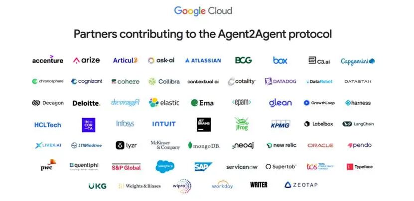 虽然刚刚推出不久,已经有50多家行业领先企业宣布支持A2A协议。这其中包括两类企业,一类是技术合作伙伴‌,比如Atlassian、Box、Cohere、Intuit、Langchain、MongoDB、PayPal、Salesforce、SAP、ServiceNow、UKG、Workday等,另一类是‌服务提供商,包括埃森哲(Accenture)、波士顿咨询(BCG)、凯捷(Capgemini)、德勤(Deloitte)、Infosys、毕马威(KPMG)、麦肯锡(McKinsey)等。这一做法和当年谷歌联合80多家企业做安卓系统开源类似,是希望打造更开放的智能体生态。