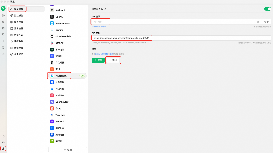 2)下载 Cherry Studio 客户端 访问 Cherry Studio [2]下载并安装客户端。(Cherry Studio 是业界主流的大模型对话客户端且集成了 MCP 功能,可以方便地与大模型进行对话。) 3)配置 API 并进行对话 单击左下角的设置按钮,在模型服务栏中找到阿里云百炼,在API 密钥输入您前面获取的 API Key; 在API 地址输入: