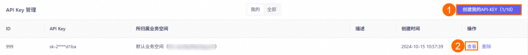 1)获取百炼 API-KEY 访问阿里云百炼控制台[1],在已创建的 API Key 操作列,单击查看,获取 API KEY。