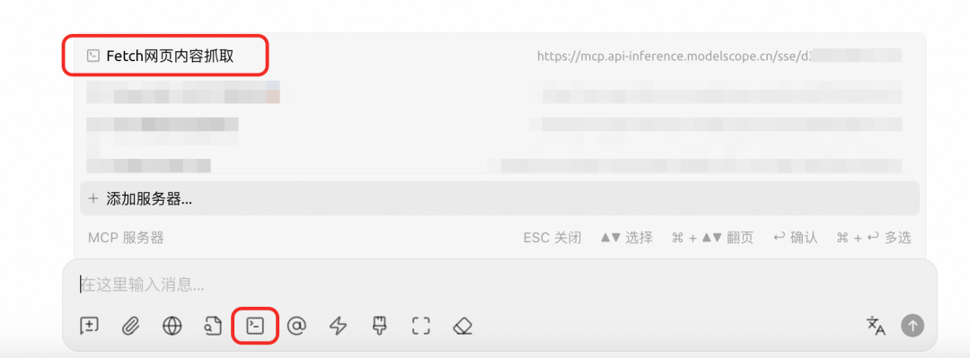 单击 Cherry Studio 左下角的设置按钮,单击 MCP 服务器,在新页面中单击添加服务器后进行以下配置: 保存后回到对话框,单击 MCP 服务器的图标,并选中添加的 Fetch 网页内容抓取。