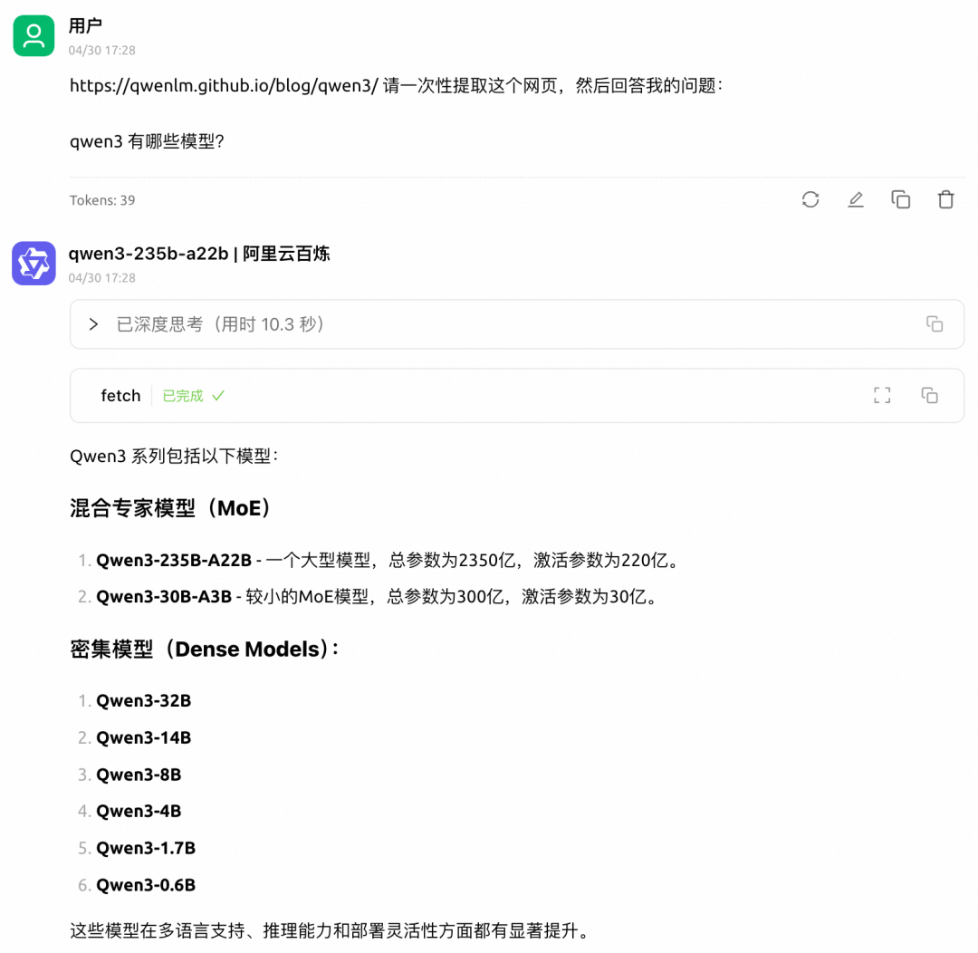 此时 MCP 服务器的图标变绿,向输入框输入问题 “https://qwenlm.github.io/blog/qwen3/请一次性提取这个网页,然后回答我的问题:qwen3 有哪些模型?” Qwen3 模型会通过Fetch网页内容抓取工具获取指定网页的内容,并准确回答问题:
