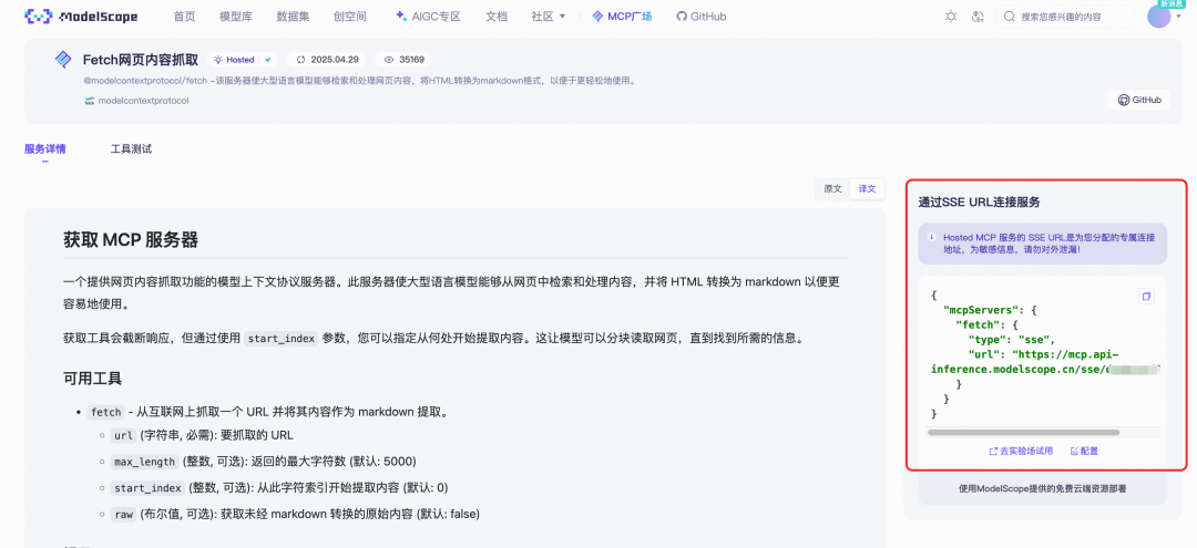 2)体验 Qwen3 的工具调用能力 Qwen3 的工具调用能力得到了较大提升,且加强了 MCP 方面的能力。此处以接入 ModelScope 提供的Fetch 网页抓取[4] MCP 服务器为例,可以通过 SSE URL 连接服务,获取专属URL。