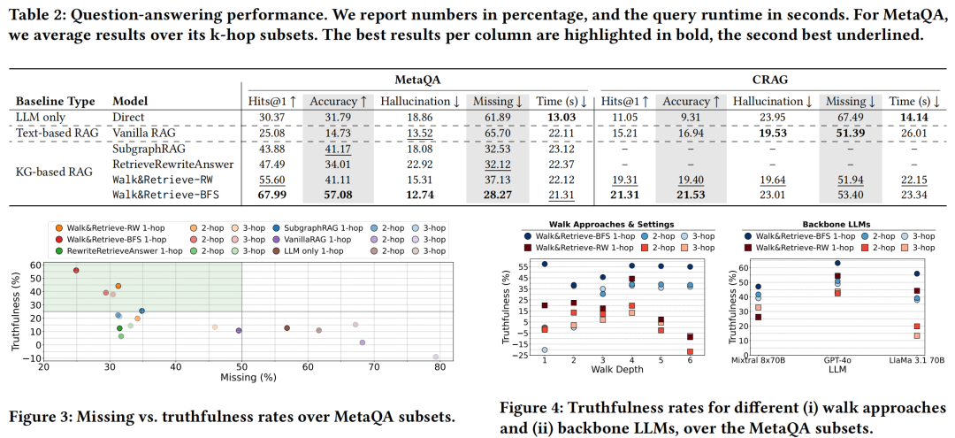 CRAG上的性能:Walk&Retrieve变体在答案准确性上优于仅使用LLM和基于文本的RAG,同时在虚假答案和无响应率上与之相当。由于CRAG的复杂性较高,Walk&Retrieve的性能略有下降,但仍表现出良好的鲁棒性。