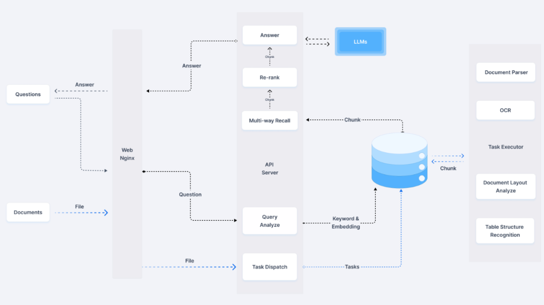 系统架构 RAGFlow的系统架构由以下关键组件构成: - 1.文档解析层:自动识别和处理各种文档格式,解析出文档中的文字、标题、段落、换行、图片和表格等元素。