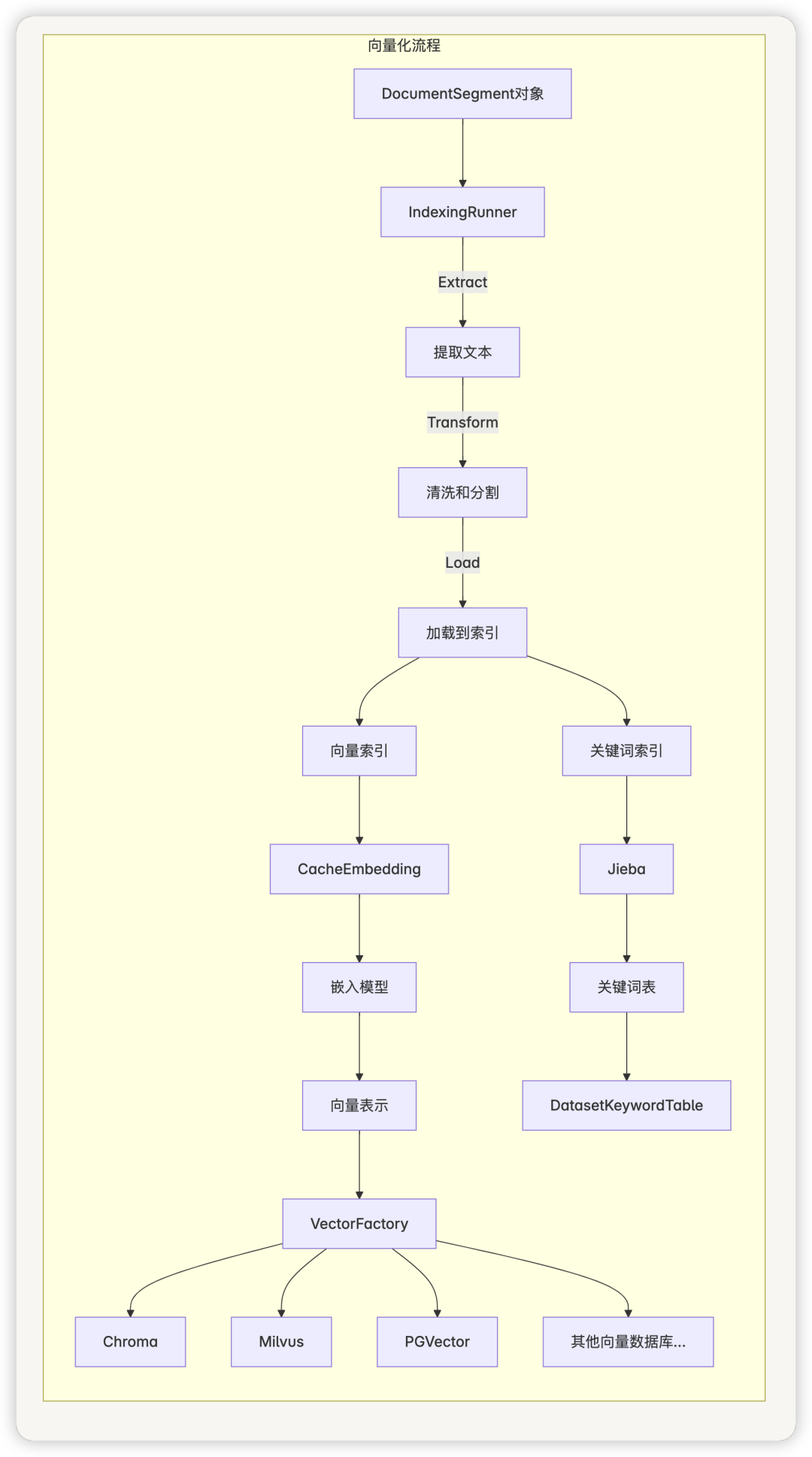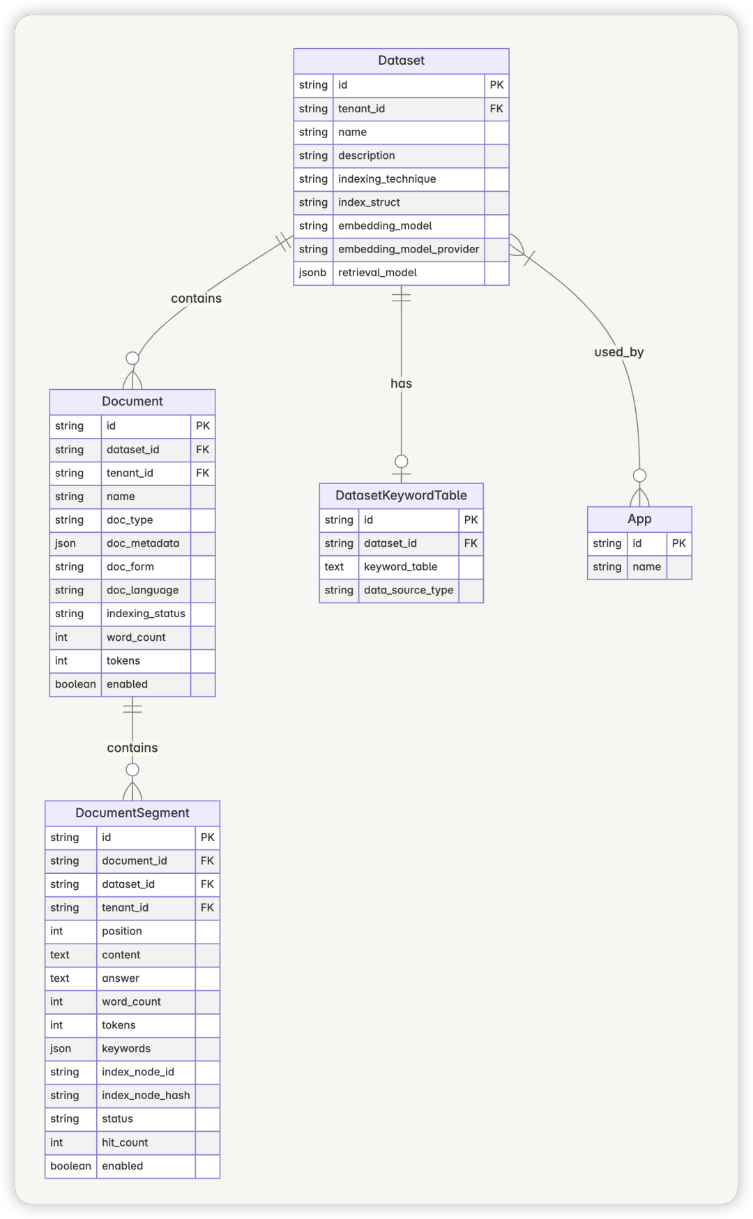 这些实体之间的关系是:一个 Dataset 包含多个 Document,一个 Document 包含多个 DocumentSegment。Dataset 通过index_struct 字段存储向量数据库的配置信息。