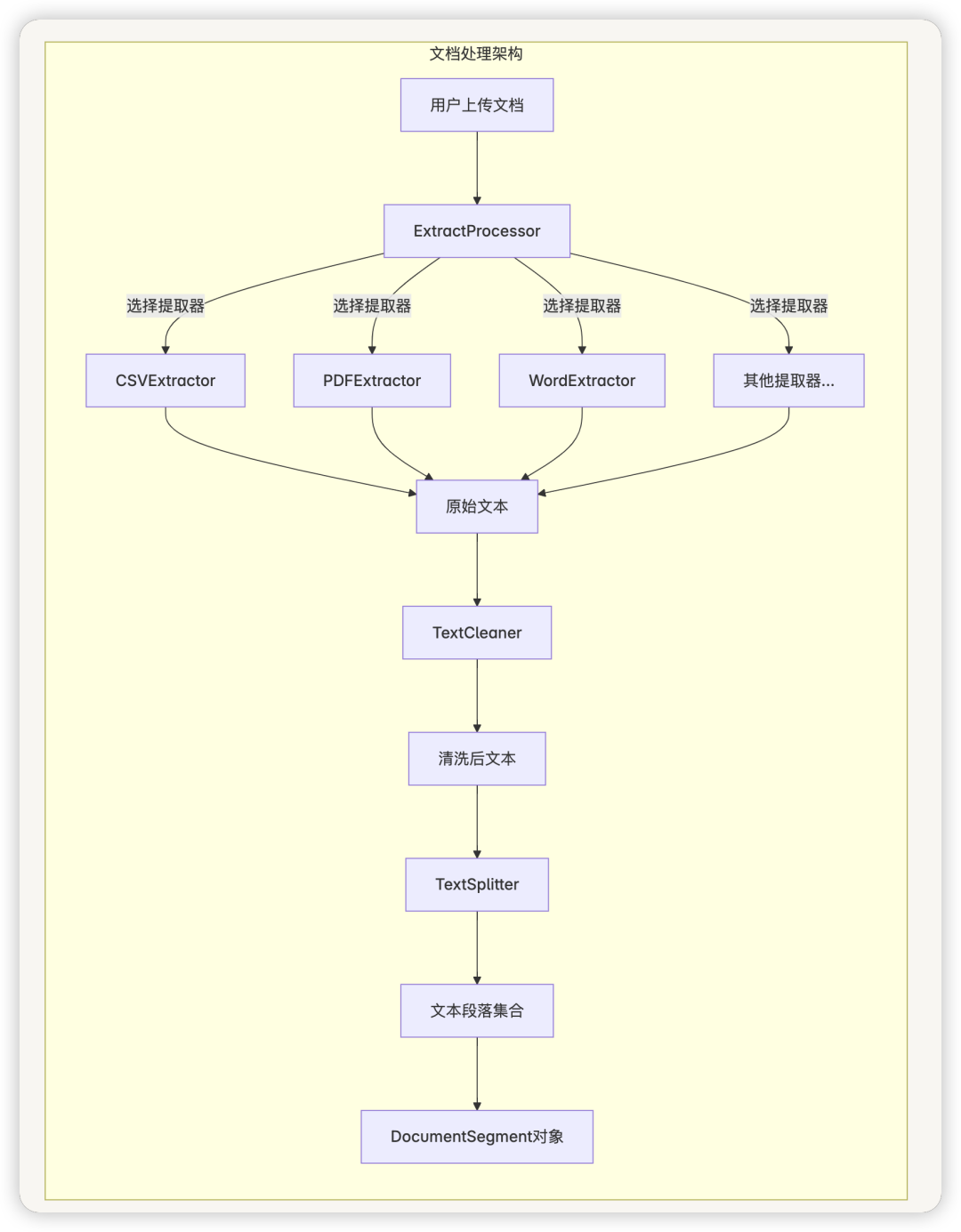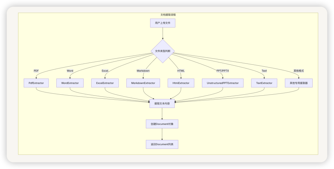 ExtractProcessor是文档处理的入口,负责根据文档类型选择合适的提取器进行文本提取。它支持多种文档格式,包括: