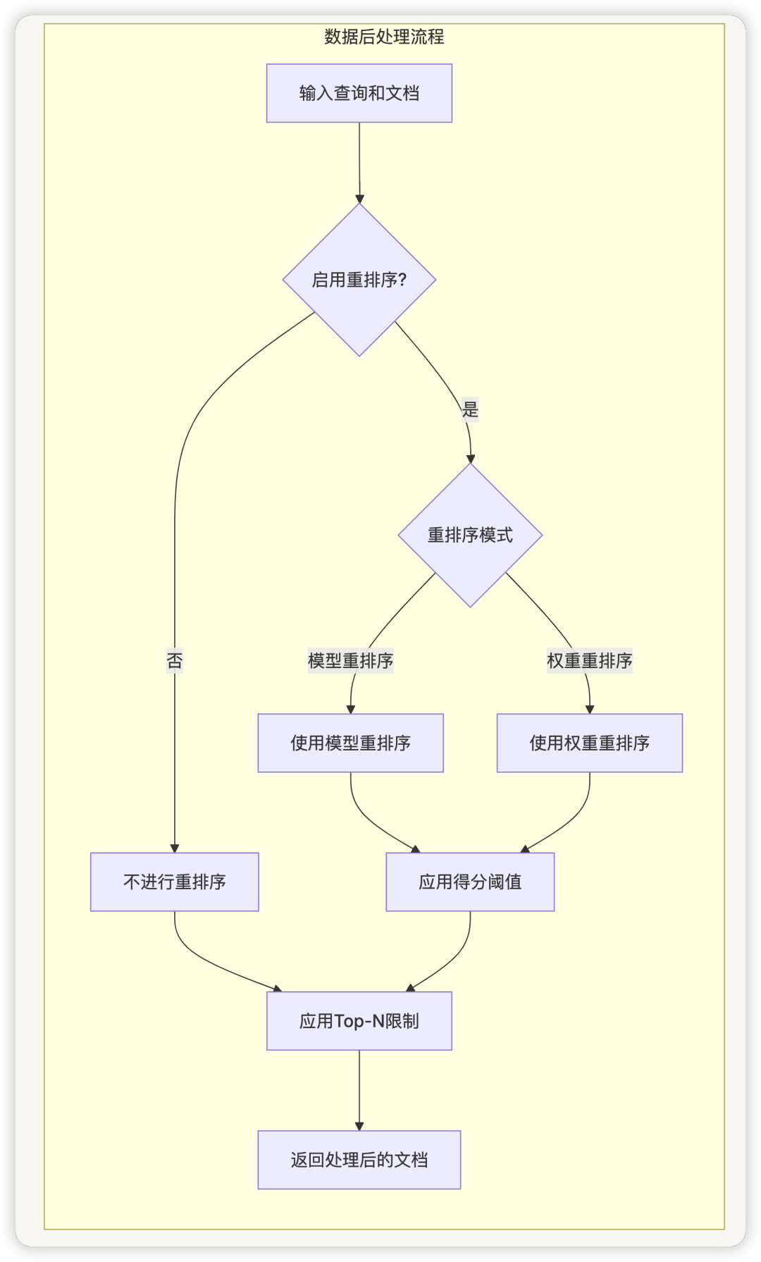 DataPostProcessor负责对检索结果进行后处理,包括重排序、去重和格式化。它支持多种重排序策略,可以根据不同场景进行配置。