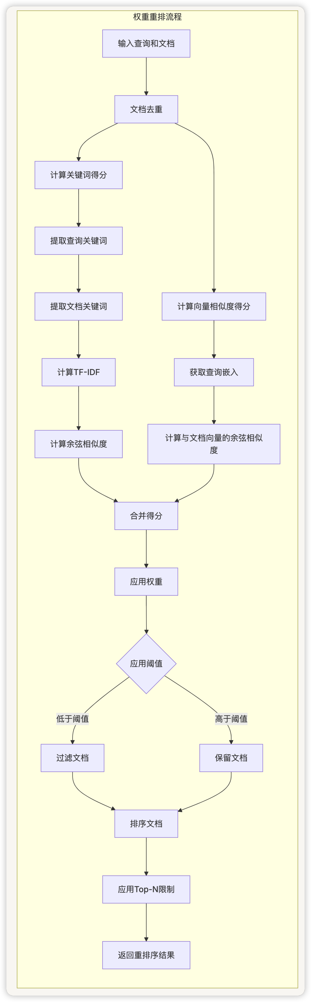 WeightRerankRunner实现了基于权重的重排序策略,可以根据不同因素对检索结果进行优化排序。它考虑以下因素: