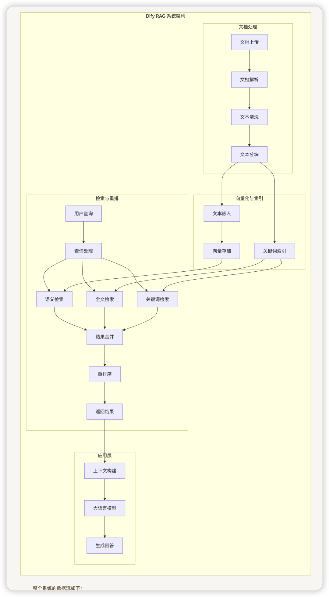 dify 的 RAG(检索增强生成)架构是一个完整的文档处理、索引和检索系统,旨在提高大语言模型生成内容的准确性和相关性。该架构由三个主要模块组成:文档处理模块、向量化与索引模块、检索与重排模块。