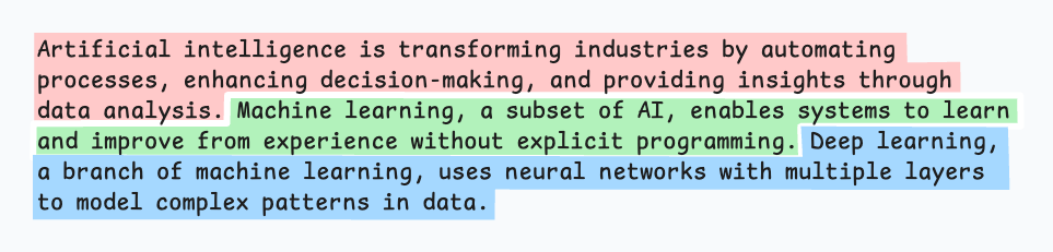 在保持固定长度的同时,尝试以语义结构(如段落、句子、标点)为边界递归地切分文本。若段落太长无法容纳于块中,则再递归切分为句子,直到满足长度要求。