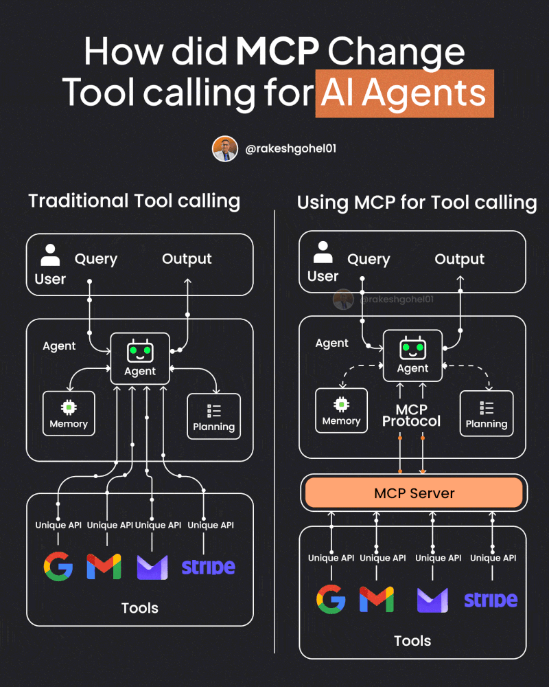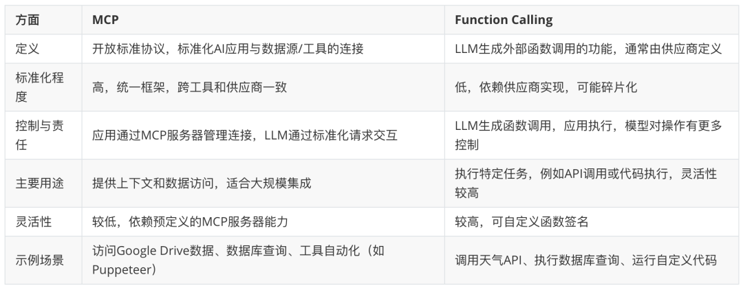 3.3 MCPFunction Calling 的问题显而易见,对于 Function 的描述各厂商存在差异,模型迁移成本高;另外 Fucntion Call 存在效果不稳定、容错性低等问题。而 MCP 标准化了 Agent 与外部资源和工具交互的接口、协议及实现。从而为构建更为健壮的 Agent 应用和推动生态的协作起到了关键作用。 3.4 对比 随着 Manus 的发布,MCP 协议得以快速普及,MCP 应用、MCP Server 服务以及 MCP 应用市场的蓬勃发展,使得 MCP 技术生态迅速繁荣起来。