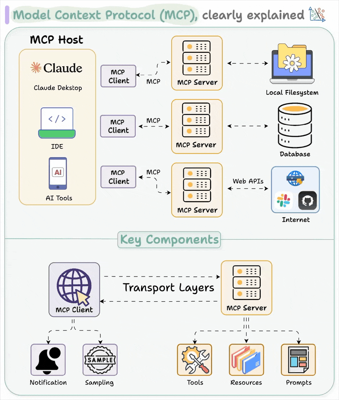 导读丨当下,随着 MCP(模型上下文协议)的迅速发展,AI 开发领域的协作生态正经历重塑,MCP 为数据应用、服务及能力提供方之间的高效协同开辟了新途径。本文聚焦于 MCP 技术及其生态系统,探索如何借助 MCP 汇聚多方能力,释放大模型的巨大潜能,塑造 Agent 应用开发的全新范式。 MCP (Model Context Protocol,模型上下文协议)是一个标准化协议,定义了应用程序和 AI 模型之间交换上下文信息的方式。这使得开发者能够以一致的方式将各种数据源、工具和功能连接到 AI 模型(一个中间协议层),就像 USB-C 让不同设备能够通过相同的接口连接一样。MCP 的目标是创建一个通用标准,使 AI 应用程序的开发和集成变得更加简单和统一。  ingFang SC", system-ui, -apple-system, BlinkMacSystemFont, "Helvetica Neue", "Hiragino Sans GB", "Microsoft YaHei UI", "Microsoft YaHei", Arial, sans-serif;font-size: 17px;font-style: normal;font-variant-ligatures: normal;font-variant-caps: normal;font-weight: 400;letter-spacing: 0.544px;orphans: 2;text-align: justify;text-indent: 0px;text-transform: none;widows: 2;word-spacing: 0px;-webkit-text-stroke-width: 0px;white-space: normal;background-color: rgb(255, 255, 255);text-decoration-thickness: initial;text-decoration-style: initial;text-decoration-color: initial;line-height: 1.75em;visibility: visible;box-sizing: border-box !important;overflow-wrap: break-word !important;">1.2 MPC 核心组件如上图所示,在 MCP 架构体系中,包含MCP Server、MCP Client和MCP Host几个核心组件,及组件间交互协议。 1.2.1 MCP ServerMCP Server 是一个通过 MCP 协议实现对外提供服务的轻量级应用,它对外提供工具执行、资源访问、预定义 Prompt 等一系列资源。 ○ 资源(Resources):类似文件的数据,可以被客户端读取,如 API 响应或文件内容 ○ 工具(Tools):可以被 LLM 调用的函数 ○ 提示(Prompts):预先编写的模板,帮助用户完成特定任务 下面是一个文件系统操作的 MCP Server 示例,它提供了对文件、目录的读写操作。