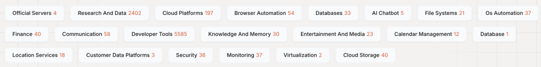 4.3 MCP Server以 mcp.so 上的 MCP Server 目录为例,我们看到 MCP Server 的范围已经涵盖数据、研究、云平台、数据库、Chatbot、文件系统、自动化等多个领域。