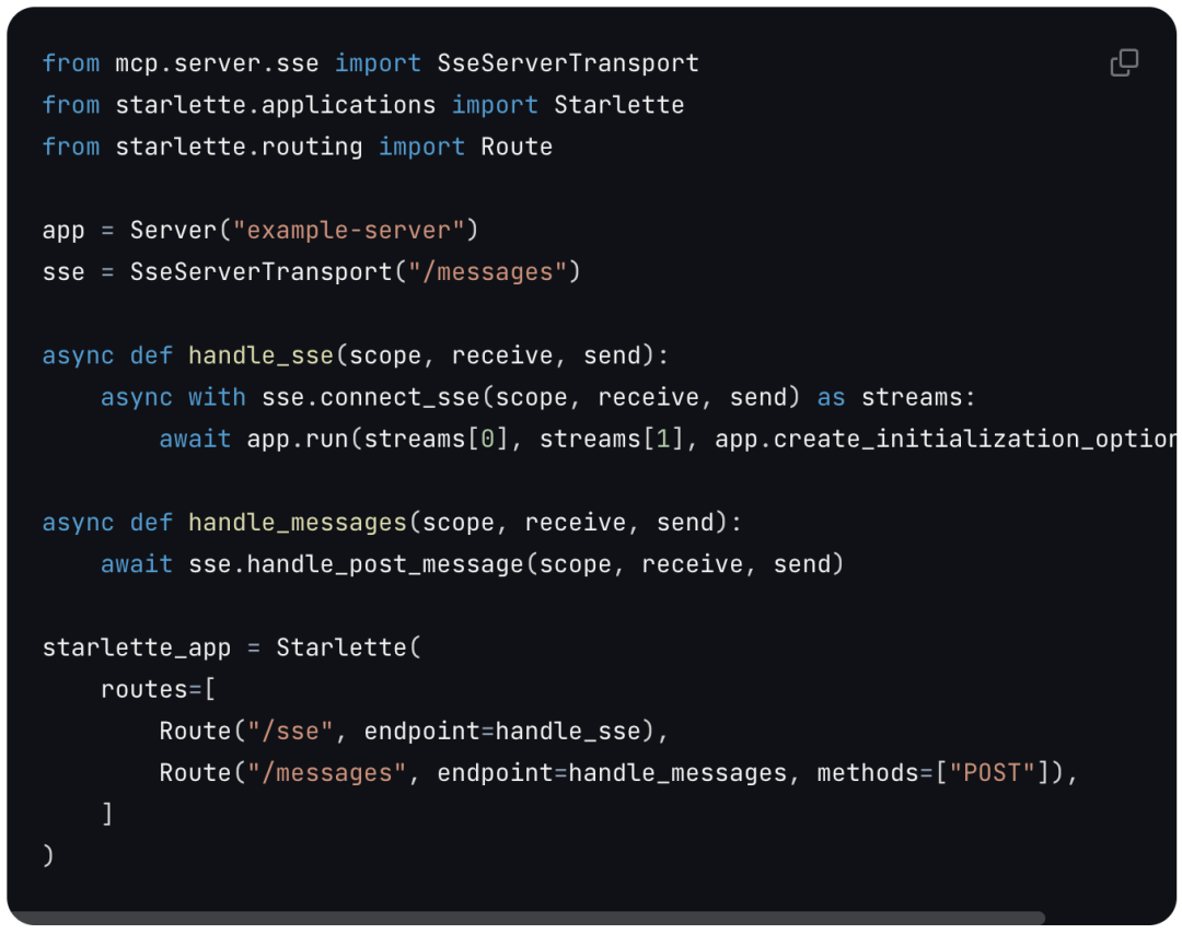 1.3.2 Server-Sent Events (SSE)远程通信:利用 SSE 与 HTTP 结合,实现跨网络的实时数据传输,适用于需要访问远程资源或分布式部署的场景。 Server