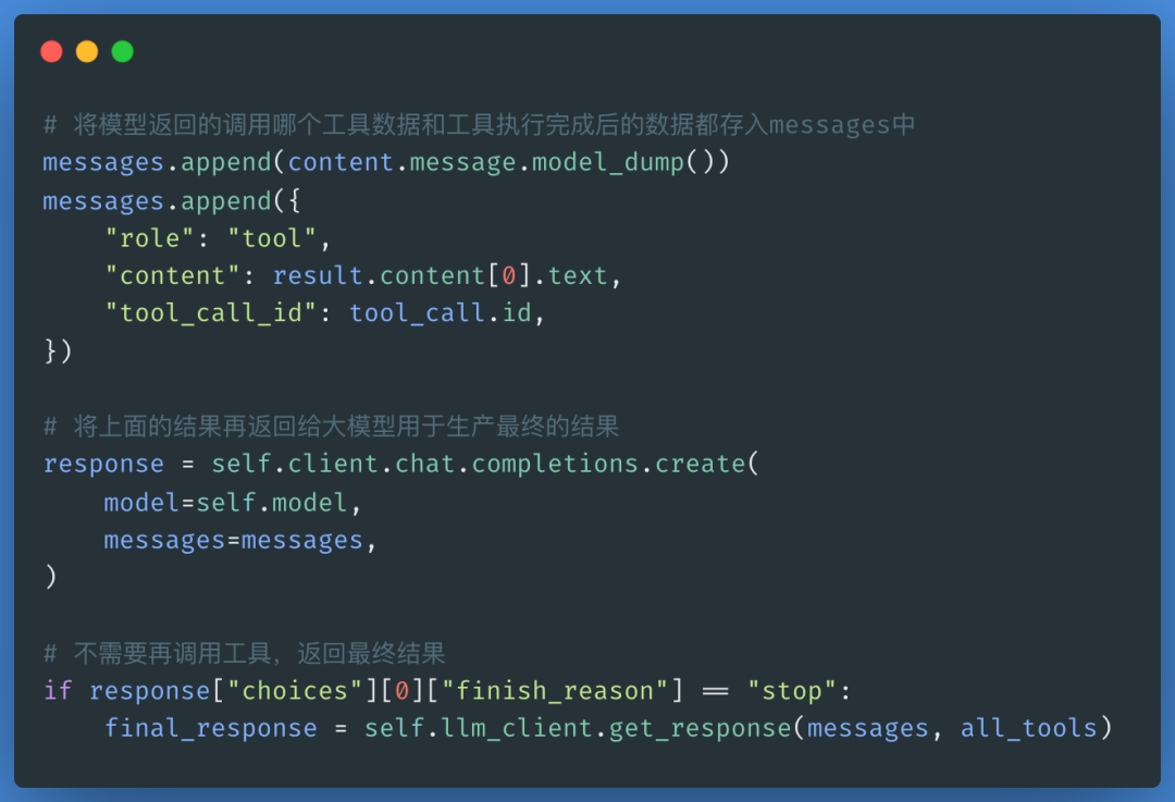 - 如果需要使用工具,MCP Client 会通过 MCP Server 执行相应的工具调用;