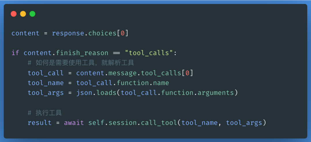 2.2 Client 调用 MCP Server大模型通过 Query 和提供的工具进行推理,确定完成用户任务需要执行的工具,如果 LLM 返回结果中如果需要执行 tool_calls,则在会话中调用 MCP Server。