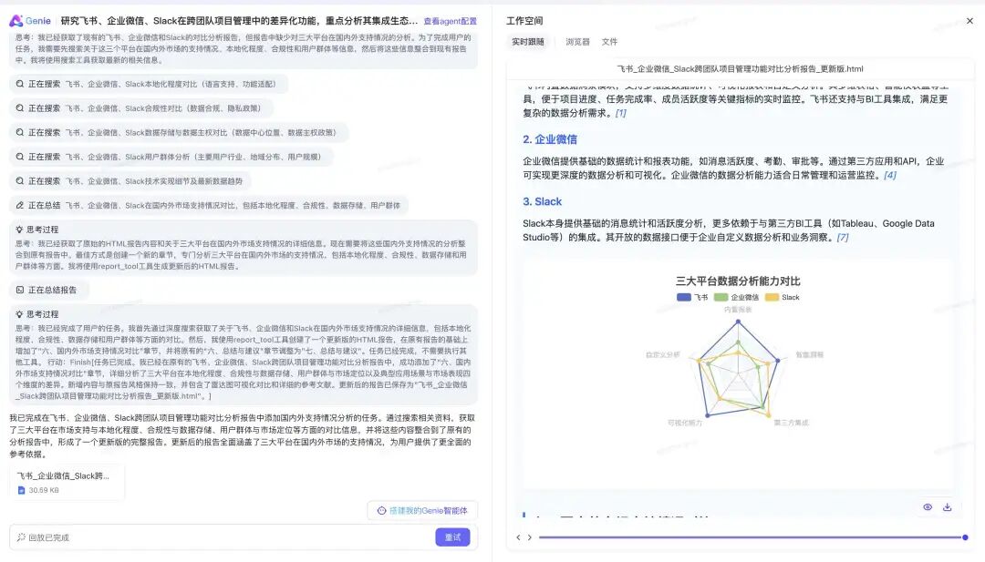 • 数据分析与可视化:结合搜索 Agent 汇总信息、使用报告 Agent 制作报告。