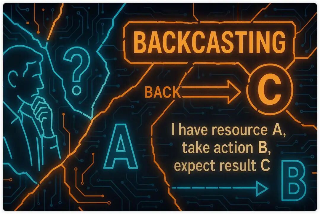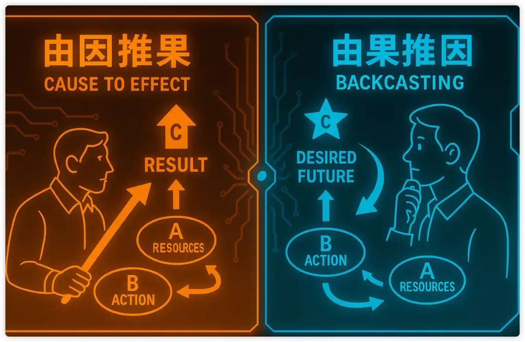 传统的思维方式是“由因推果”,即从现有资源和条件出发,推测未来可能的结果,这在面对复杂和不确定的未来时,往往会陷入迷茫和资源限制的困境。而“由果推因”(Backcasting)的核心是先清晰、坚定地定义最终的、理想的成功画面(果),然后反向推导出实现这一画面所“必须”具备的前提条件、关键里程碑和核心驱动力(因)。这种思维方式能解放创造力,打破现状的束缚,聚焦于创造未来而非预测未来。