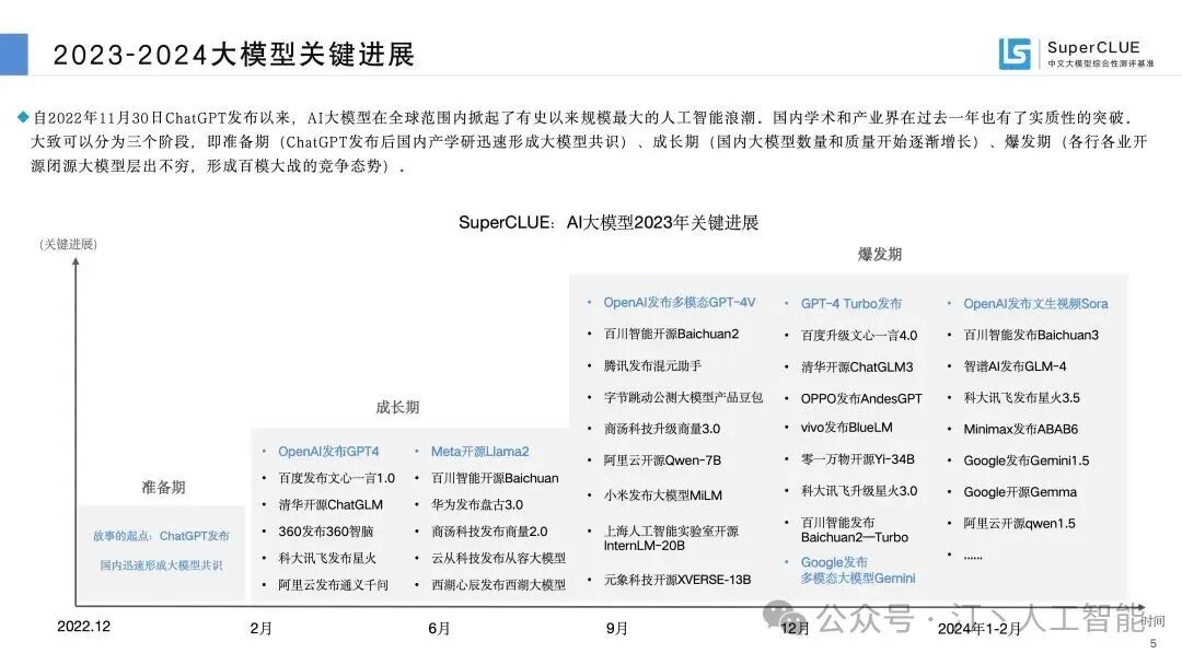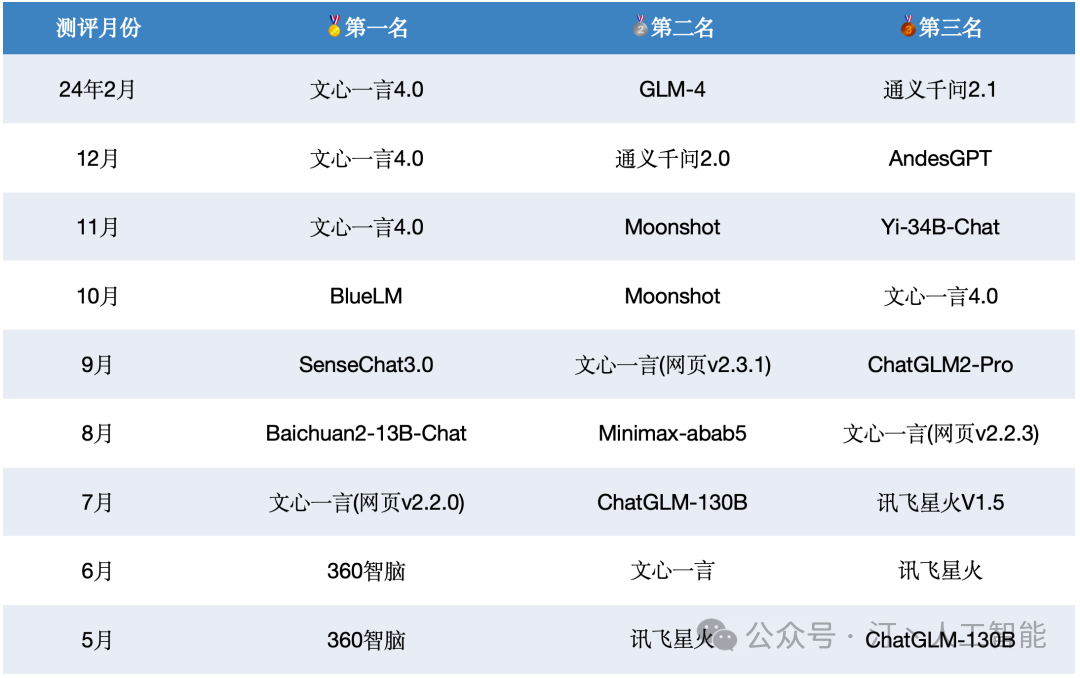 SuperCLUE月榜首位的大模型有5个。分别是文心一言、BlueLM、SenseChat3.0、Baichuan2-13B-Chat、360智脑。其中,百度的文心一言登顶SuperCLUE月榜的次数最多,分别在7月、11月、12月、24年2月取得了SuperCLUE最好成绩。