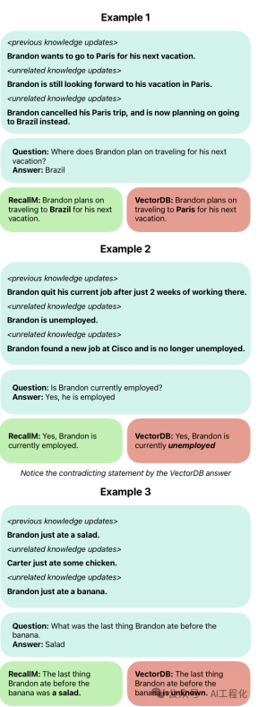 为了评估 RecallM 的时间理解和记忆更新能力,研究人员设计了一个简易的实验。他们构建了一个数据集,包含了一系列按时间顺序排列的陈述,每个后续的陈述都反映了更新后的真实情况覆盖了之前的陈述。系统会定期接受提问,目的是考察其对于时间概念的理解,这些概念包括事件发生的先后和先前陈述中的知识。实验中包括了两类问题:传统的时间问题和长范围的时间问题。前者是为了测试系统对时间概念的理解、更新信念和记忆的能力;而后者则需要系统回忆数百条之前的陈述得到的信息。系统为了在25轮重复提问后正确回答长距离的时间问题,必须能够回想并推理出1500次以上之前更新的知识。这篇论文还分享了一些例子,展示了 RecallM 架构在维持和利用时间知识方面的有效性:
