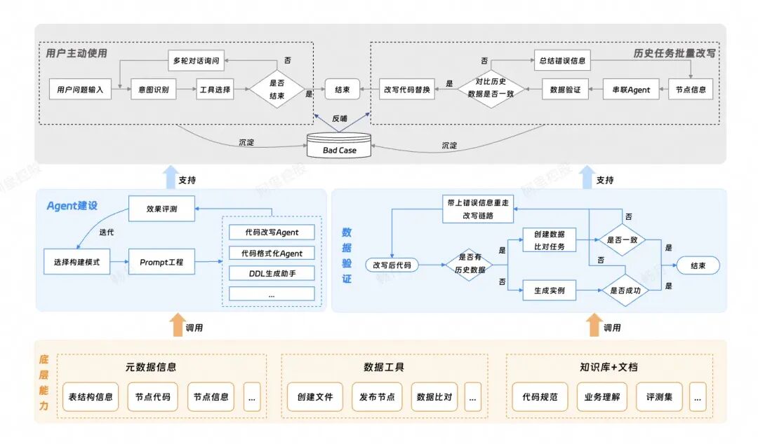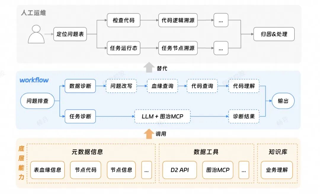 3.4.3. 效果展示原始代码: 改写后的代码: 原始输出结果 复制到D2编辑器中 小D明明已经通知了下游要改的地方需要在什么时候修改完毕,历史模型会做下线处理,然而过一段时间还是被业务找上门了,说他的数据产出有问题。小D汗颜—_—|||,赶紧帮忙看下到底是啥问题...... 日常工作过程中,除了将业务的需求按期高质量交付,我们也需要保障数据和任务的稳定性,而不影响线上数据的产出,当出现问题时,我们希望【问题排查】可以自动帮我们定位到问题点,减少我们耗时费力的排查过程。 3.5.1 场景盘点线上的数据产品,我们最常被问到的问题就是这个数据的口径是什么,或者这个指标怎么和另一个地方的数据不一致。即使是个深耕业务的研发老手,也会因为接触的任务太多而忘记这个数据的具体口径是什么,然后去深扒指标的代码逻辑,当业务逻辑比较复杂,依赖的链路较深时,花上0.5-1个人日都是有可能的。在我们的场景当中,我们主要围绕我们最常见的几个问题进行重点提效: 3.5.2 解决思路和方案回想一下,当面临数据异常或者任务出错时,传统排查流程往往需要我们手动梳理任务链路、解析代码逻辑,这种人工排查方式存在效率低、耗时长等问题。为此,我们希望建设【问题排查Agent】,通过以下两大核心模块实现自动化问题定位: