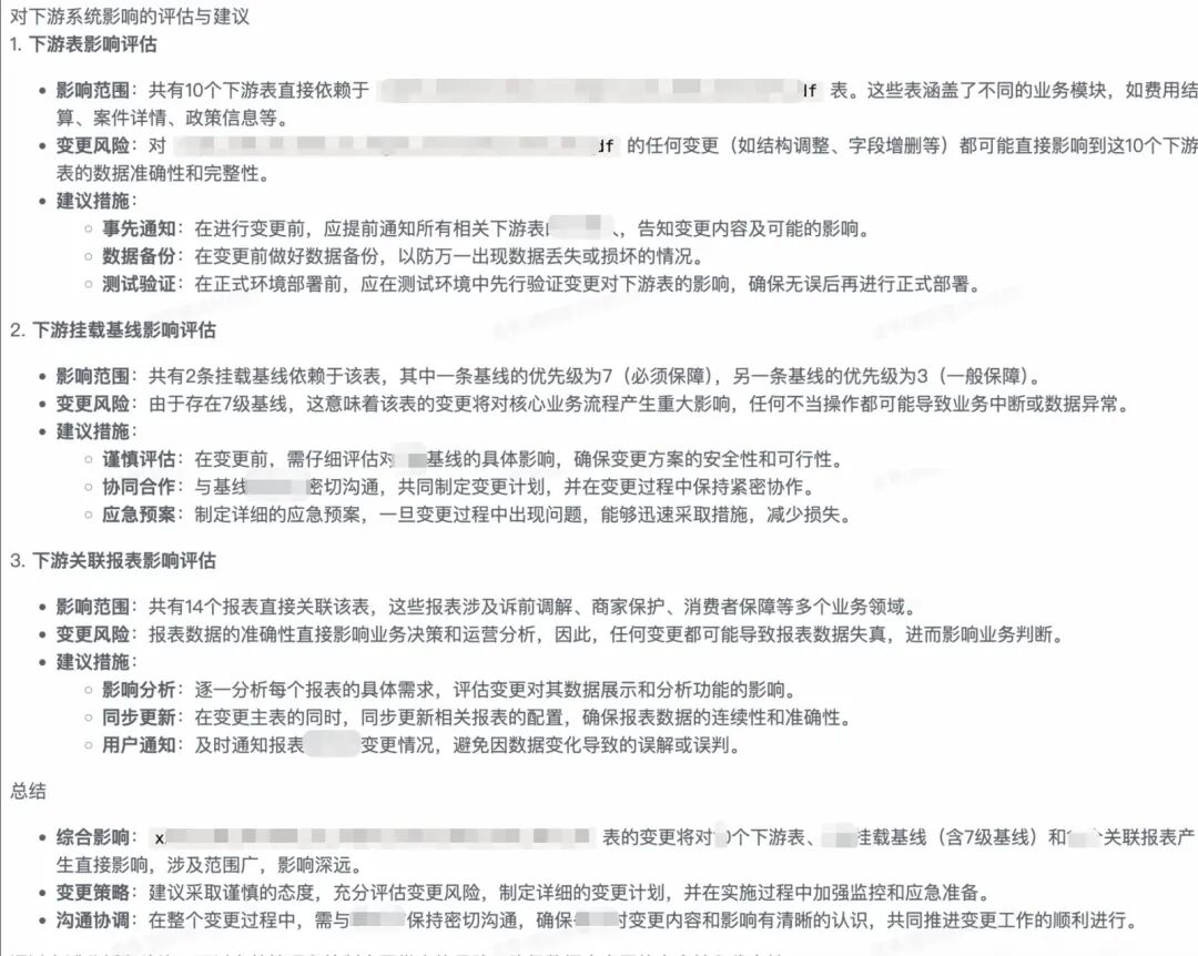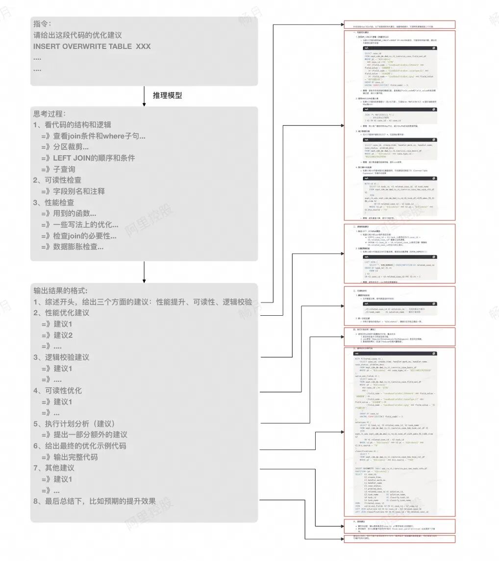 经历千辛万苦,小D的数据模型评审得到了团队内同学的一致通过,终于可以进入开发阶段,围绕他新设计的表,他志得意满地开发完了,结果在Code Review的时候,发现只有师兄可以帮忙CR,有时等师兄在开会,或者周末又不好意思打扰他。于是小D想,要是有个24小时在线,且能快速给我CR建议的Agent工具就好了。 既然团队有数据模型规范,还有统一的代码风格,我们就可以依托AI来实现代码的Code Review,减少人工CR,提高CR的效率及准确性。 3.3.1. 场景盘点首先,我们还是先盘点Code Review场景里可能会遇到的问题,并展开这部分可能的问题方向。 3.3.2. 解决思路和方案结合上述的5个细化后的方向,我们分模块进行解决思路的剖析及方案设计。 1)首先是代码规范检查,目标很明确,确保SQL代码符合团队规范(语法、命名、注释、格式等),这里我们只需要依托强大的基座模型 + 私有知识库即可实现,多次调整Prompt后即可实现标准化的输出。私有知识库部分是完全可以依托【模型评审】场景的积累,快速复用的。 2)代码影响评估方向,目标是分析SQL潜在的问题,包括如数据倾斜、数据膨胀等在内的性能风险,这里我们需要依靠工具服务去完成一些关键信息的提取,如表数据量、字段探测后的枚举值等,Workflow模式不太适用,而建议使用ReAct模式,同时可以在Prompt里可以构造一些few-shot来帮助提高鲁棒性。 3)在代码版本演变方向,目标是解释追踪SQL代码的版本差异,总结变更内容,这其实是我们在接收前人代码的时候,可能会关心的事情,尤其是多次版本迭代后,可能有太多的Monkey patch式的代码妨碍我们阅读。这个方向上,目前强大的基模都可以满足代码解释,所以这个场景不需要做太多Prompt的约束,只需调整输出的形式,找到方便我们快速阅读理解的Output形式就可以。 4)代码优化建议方向其实同方向3一样,基模已经很强大,结合RAG和Output形式的调整,即可做的较为优秀。从下图的case可以看出,在使用Qwen3-32B的基模情况下,即便未做太多Prompt的约束就能输出一份很完整的SQL优化建议报告,虽然有些优化点存在幻想,不过稍微做一些Prompt的调整即可输出更好的结果。