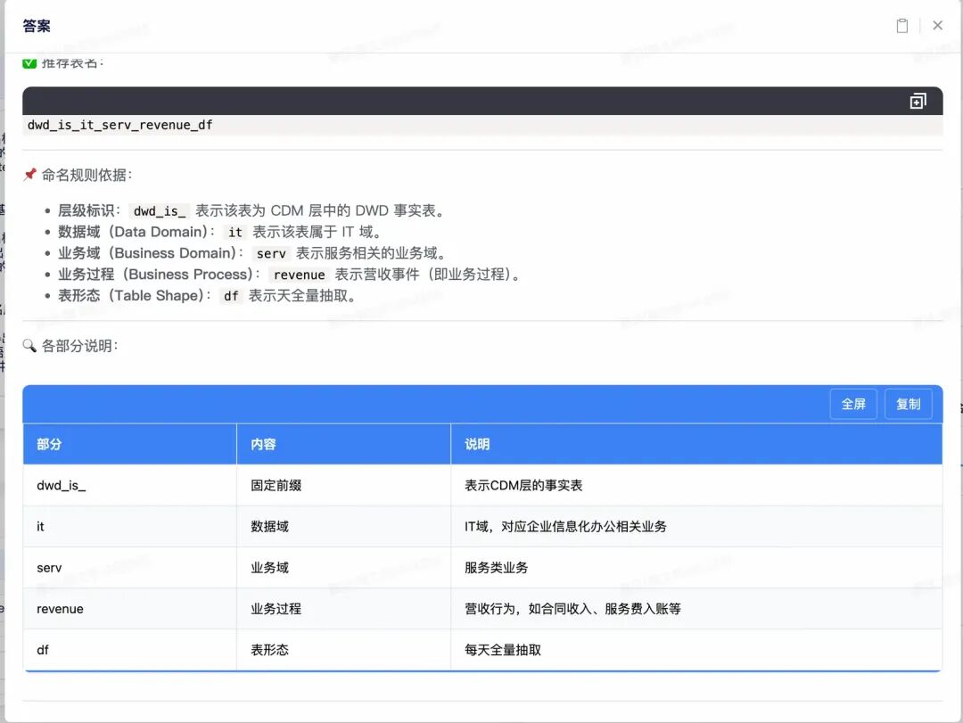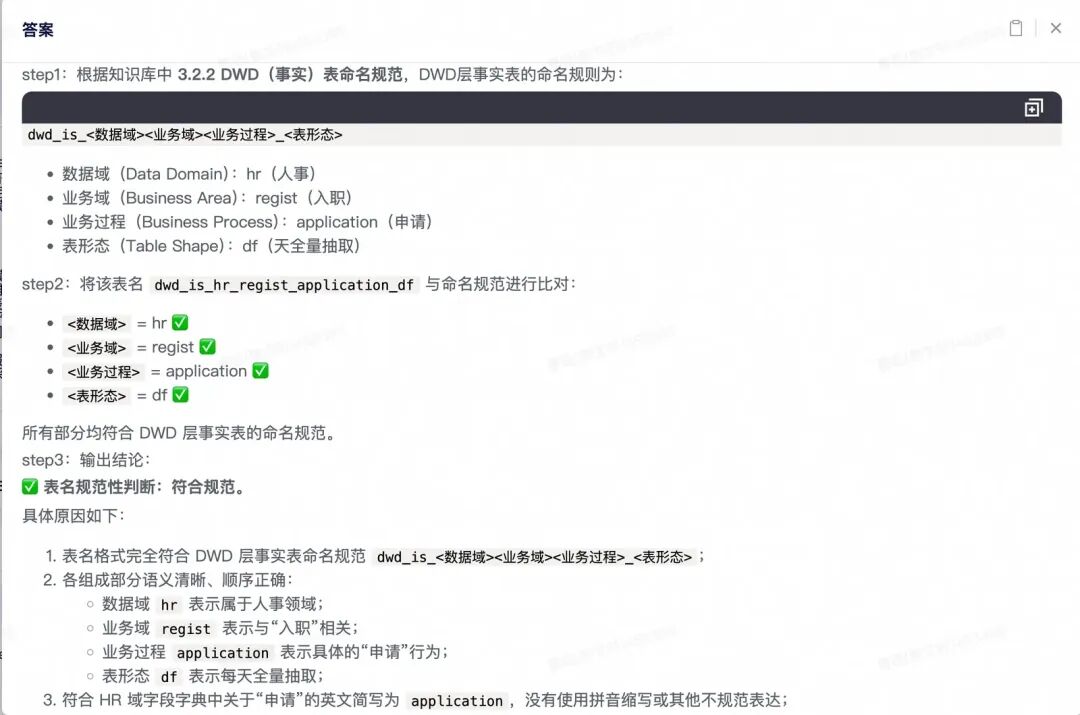3.2.2.1 通用大模型选型俗话说:“工欲善其事,必先利其器”。大语言模型是构建Agent的基础,针对于不同的场景,大模型的选型非常重要。为了选出适用我们场景的基础模型,我们分别测试了市面上通用的大模型,并从稳定性、性价比、输出效果几个维度进行了综合考虑。Tips:测试结果仅是从我们的场景上出发,并不代表大模型在其他通用场景上的性能。 基于以上测试结果,针对于本场景,最终决定选择Qwen系列的Qwen3-32B作为基准模型。 3.2.2.2 Prompt构建选好了合适的通用大模型,配套合适的提示词也至关重要。为了实现设计评审和文档评审子Agent,我们按照:角色 - 技能 - 限制 -示例 的结构设计了详细的prompt。 3.2.2.3 知识库构建知识库是Agent构建的核心支撑,为其提供领域知识、业务规则和上下文信息,显著提升其理解、推理和决策能力。它可以为大模型提供某一特定业务场景的先验知识,使Agent能按照规则准确回答专业问题,尤其在垂直场景中不可或缺。在模型评审的场景中,我们主要构建了三类知识库: 3.2.3. 效果展示评测方向 | 评测问题 | 效果截图 | 是否符合预期 | 表命名咨询 | 我要在cdm层创建一张IT域服务营收的dwd表,该怎么命名 |