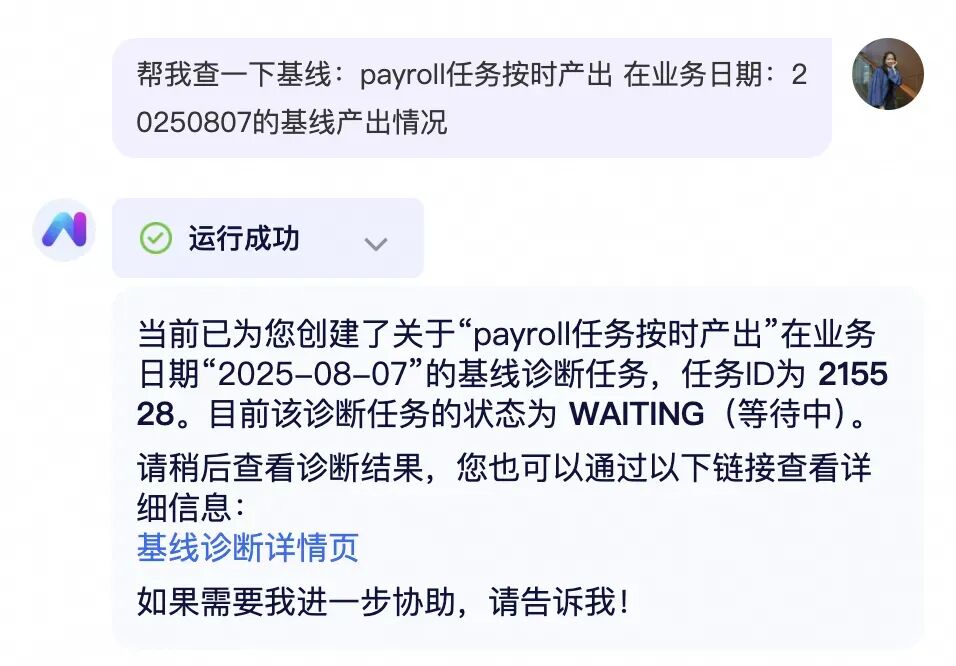 借助这部分MCP能力实际已经可以直接帮助我们解决掉现有的一些问题:单一任务诊断和基线诊断,而针对单一任务未挂载到基线上的,我们可以通过任务上游血缘辅助分析。 Tips. 图治的MCP能力需要以工号作为参数传入,而在AIstudio上选择用编排式Agent可以将用户的基础信息,如工号等作为输入给到大模型,从而不需要在用户输入中多加指定。 3.5.4 效果展示