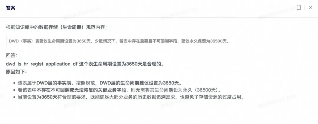 | 是 | 生命周期咨询 | dwd_is_hr_regist_application_df这个表生命周期设置为3650天合理吗 |