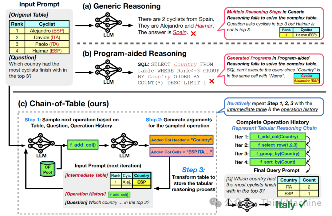 这里我们用一个常见的关系数据库查询场景为例,看看三种推理方式(一般推理(Generic Reasoning)、程序辅助推理(Program-aided Reasoning)和表格链推理(Chain-of-Table))会如何实现这个场景。场景的输入数据是一个包含4位自行车选手排名信息的表格,以及一个关于"哪个国家在前3名中拥有最多的自行车选手"的问题。