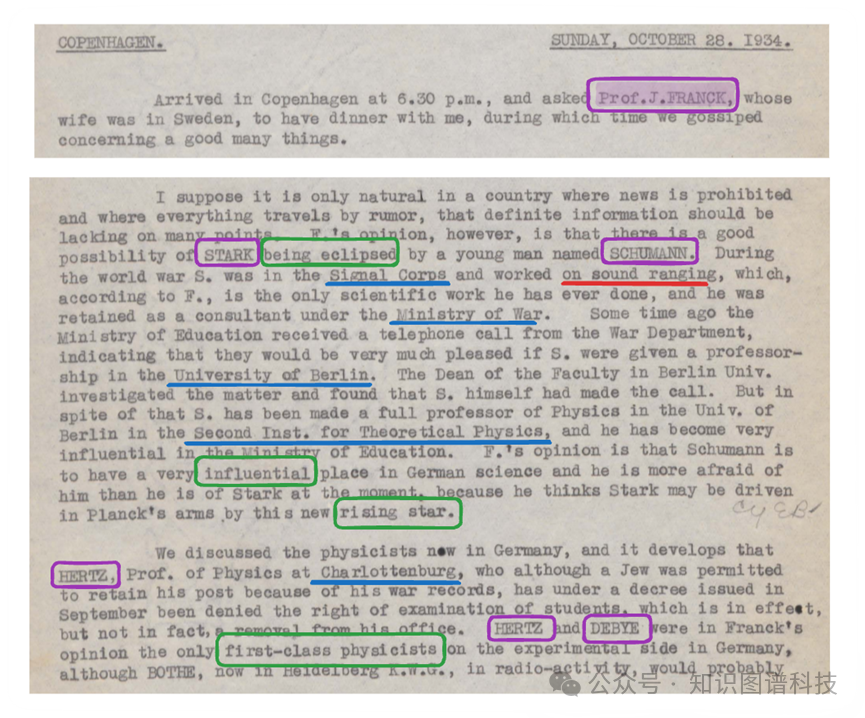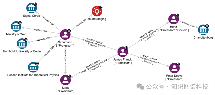 从文本中清楚地可以看出J. Franck 对一些同事的意见。首先,他谈到了Stark和Schumann,表达了Schumann胜过Stark的观点,然后他引用了Hertz和Debye作为德国一流的物理学家。所有这些信息都被正确地提取出来了,下面的图表包含了结果图。