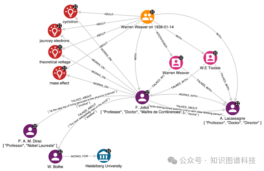 这个例子展示了我们如何以强大的方式表达两位RF军官之间的对话,他们分别是沃伦·韦弗和W·蒂斯代尔,以及两位科学家W·E·蒂斯代尔和A·拉卡桑尼日和F·约里奥。后者还提到了W·博特和P·A·M·狄拉克的研究活动。通过阅读这段文本,你会注意到这两个人只用他们的姓氏提到。而且,之前的文本上下文中没有包含他们的全名。然而,构建高质量的知识图谱的一个关键方面就是识别出同一人或组织,超越他们在不同页面或文档中的多个表达方式,以解决多义实体,并用唯一的节点来表示它们。
