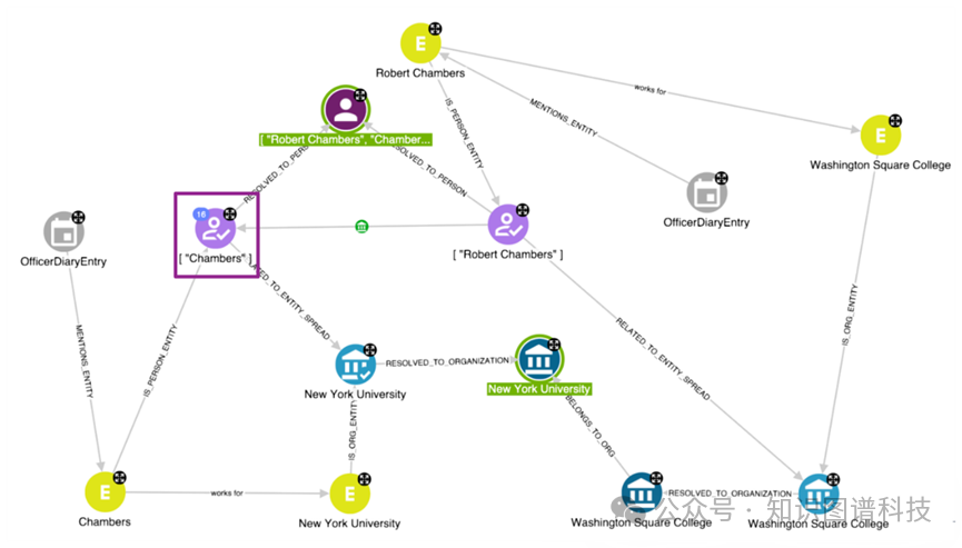让我们来看看这些规范化步骤对人物解析的影响。下面的图表显示了为什么必须将“柴伯斯”(Chambers)和“罗伯特·柴伯斯”(Robert Chambers)节点解析为同一人。第一个明确表示在纽约大学(New York University)工作。第二个在华盛顿广场学院(Washington Square College)工作。然而,GPT认识到这两个学府是相关的。根据维基百科上的纽约大学页面报道:
