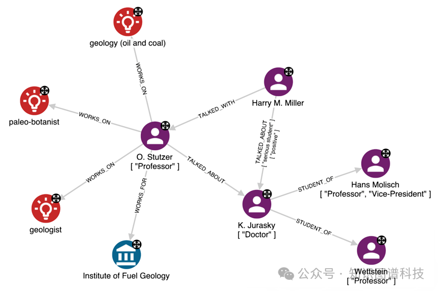 正如您从此示例中所看到的,字符串“O. Stutzer”和“K. Jurasky”被识别为人物实体(紫色节点),而“paleo-botanist”和“geologist”等字符串则被识别为职业实体(红色节点)。此外,在人物实体的情况下,该模型能够协调不同的命名方式,并以一种有效的方式执行关系提取,将“O. Stutzer”与相关实体连接起来。