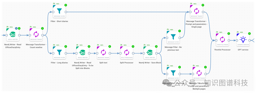 上图展示了用于处理ODE文本的Orchestra工作流程。更准确地说,为了处理前面提到的情况,我们定义了两个分支:一个简单的分支用于处理短日记条目,另一个更复杂的分支用于首先将长日记条目的文本分成块,然后再进行处理。这个分割步骤的采用是为了管理所使用的GPT模型(gpt-4)的令牌限制,更重要的是为了限制响应质量与长输入相关的退化。我们注意到,在这类任务中必须考虑这个方面,并且还要注意使用生成模型从文本中提取事实的一般情况。