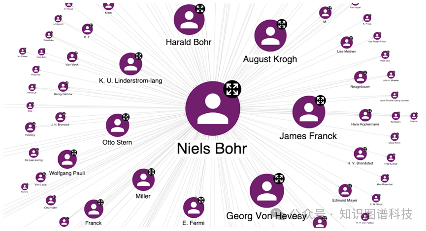 假设你查看了尼尔斯·玻尔的维基百科页面。该页面提到了来自这个社区的几位科学家(请参见下图),例如奥托·斯特恩、哈拉尔德·玻尔、乔治·冯·赫维希和詹姆斯·弗朗克,他们属于尼尔斯·玻尔的科学领域。一方面,这证实了从OD中产生的网络动态与这些科学家,特别是尼尔斯·玻尔,相关的众所周知的知识相一致。另一方面,我们对发现与尼尔斯·玻尔对促进不同科学领域的资金支持相关的长尾信息感兴趣。