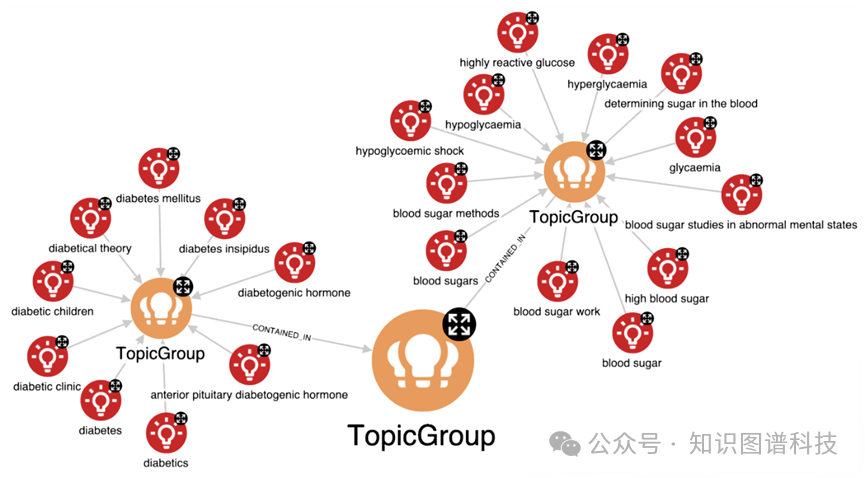 关于这些话题,我们的目的是根据语义相似性将它们分组。为了实现这一目标,我们决定共同利用嵌入和聚类操作。前者使我们能够将话题投射到向量空间中,嵌入越接近,话题之间的语义相似性就越高。更准确地说,通过text-embedding-ada-002 GPT模型计算嵌入。后者利用这种接近性,根据所需的语义细粒度使用分层聚类将话题分组。下图显示了与高血糖相关的簇(组)。话题被分组为TopicGroup节点,这些节点本身以分层方式分组。这使得可以根据用例选择最合适的语义粒度,例如较粗的粒度可以将与高血糖相关的簇与与糖尿病相关的簇合并。嵌入和聚类操作都是使用Orchestra执行的。